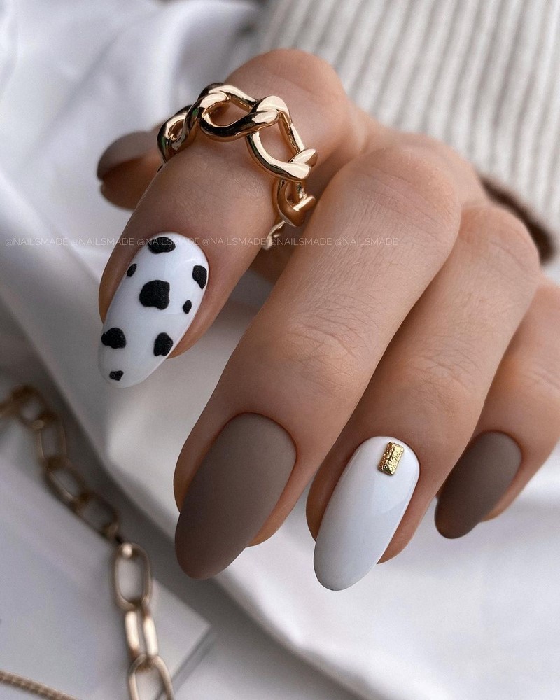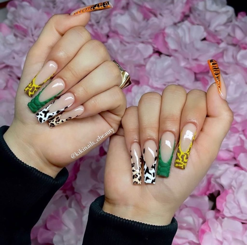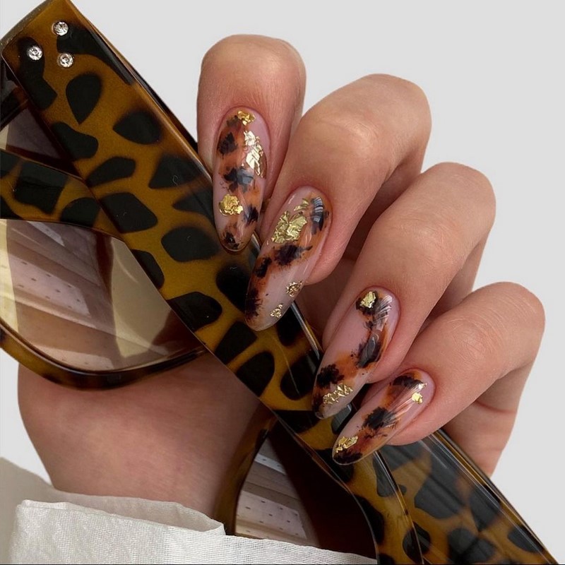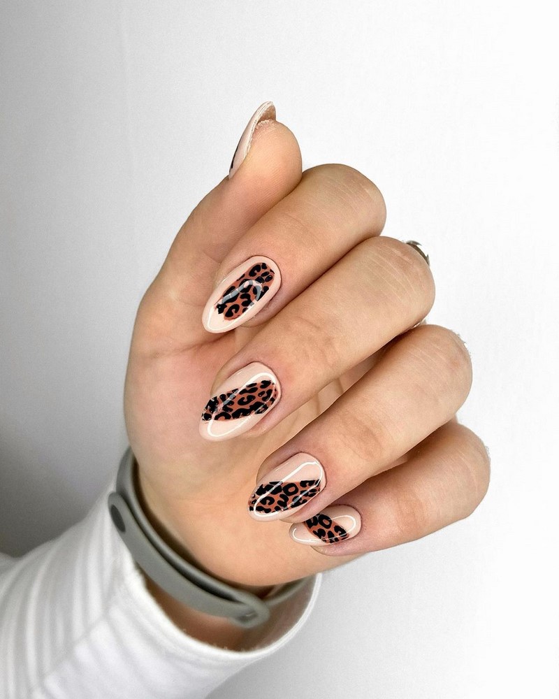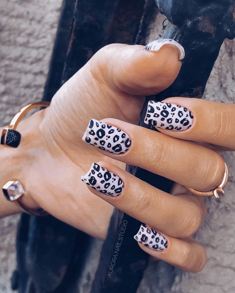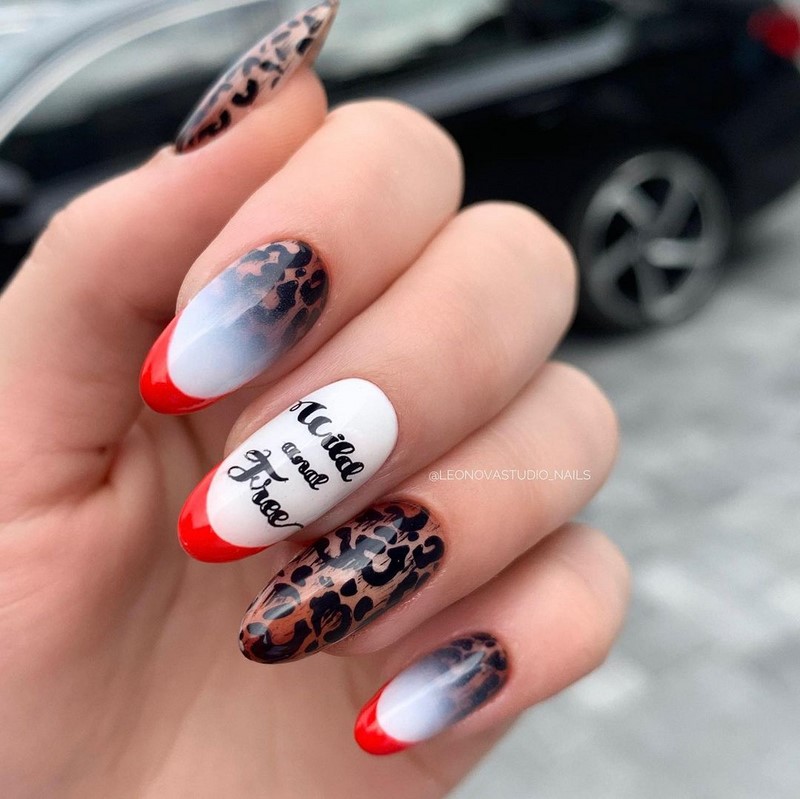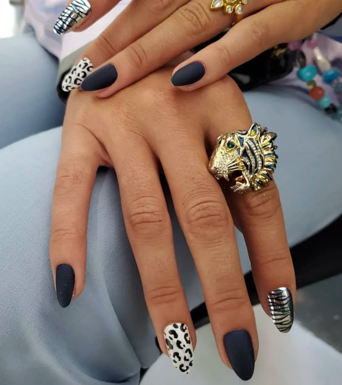 Животный принт обрел популярность с наступлением года тигра. Но в этом сезоне актуальны любые другие фактуры — змеиный, леопардовый, зебровый принт. Стильно и мило смотрятся ногти с фактурой жирафа, коровы, крокодила и любого другого животного. Сочетайте дизайн с матовым топом и маникюр будет модным и актуальным. Необязательно оформлять животным принтом все ноготки, достаточно сделать такой активный акцент всего на одном пальчике.