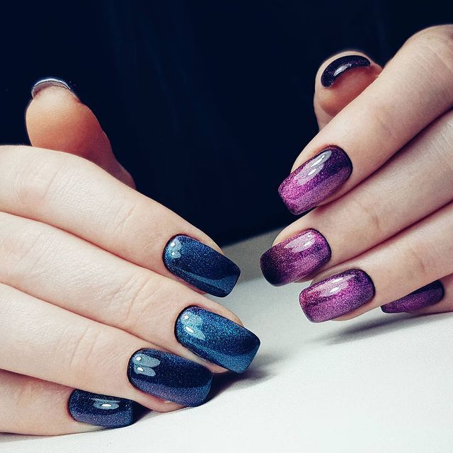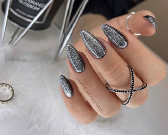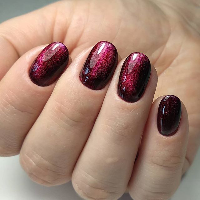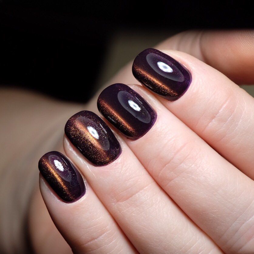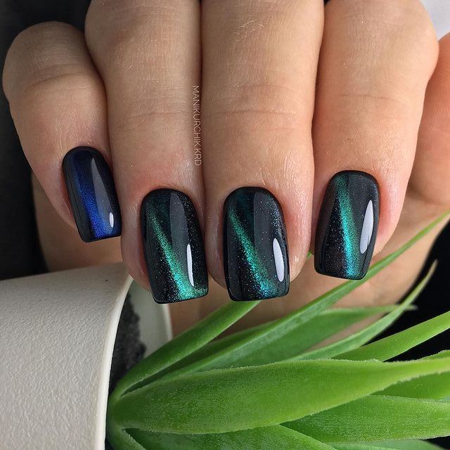 Не хочется дополнительного дизайна? Сделайте стильный маникюр с помощью магнитного лака. Кошачий глаз — это потрясающий эффект с загадочными переливами. Он может быть самостоятельным дизайном или его можно дополнить паутинкой, стразами или блестками. Мы уже отмечали, что матовый топ ультра популярен в этом сезоне. Магнитный лак эффектно смотрится и на такой текстуре.
