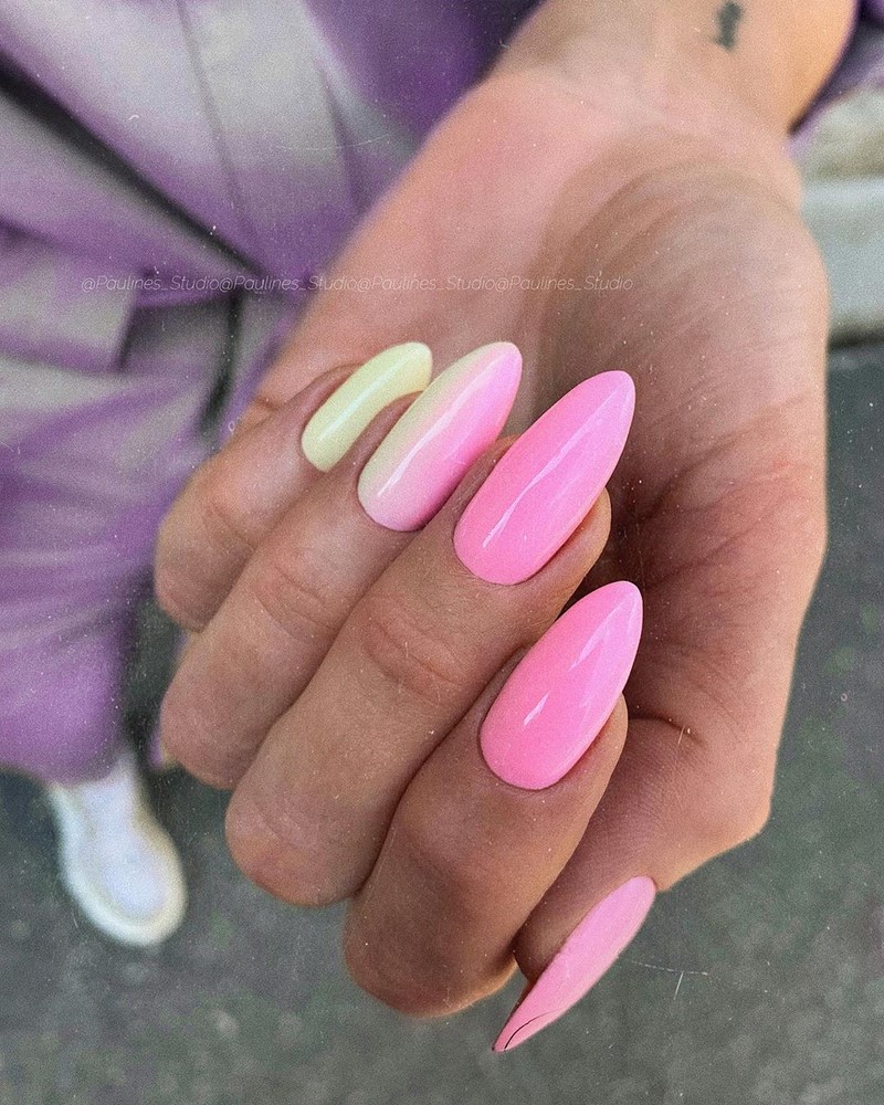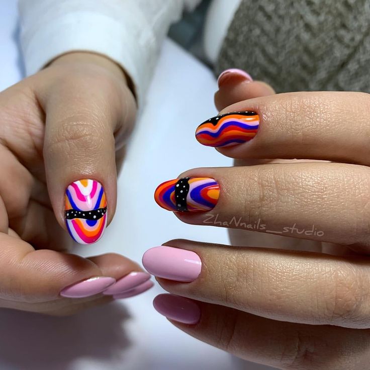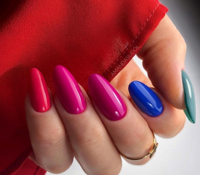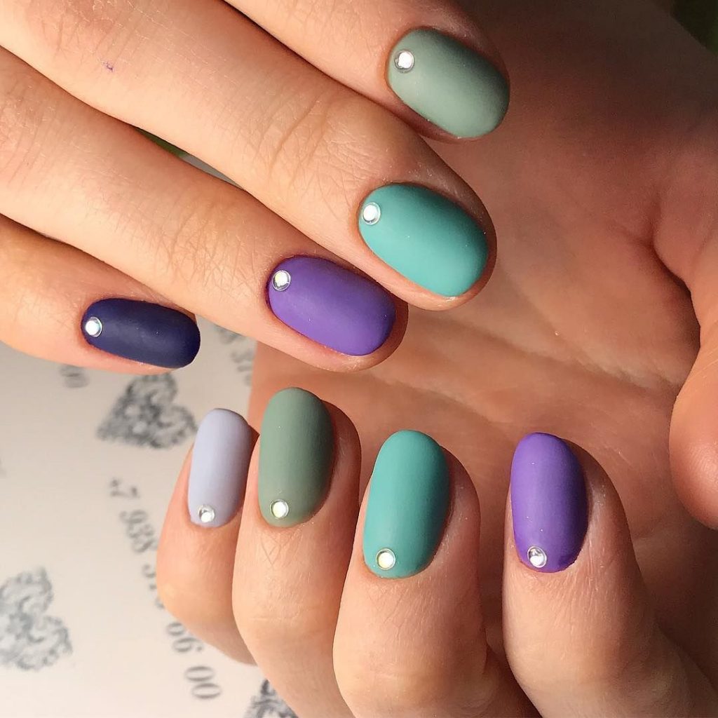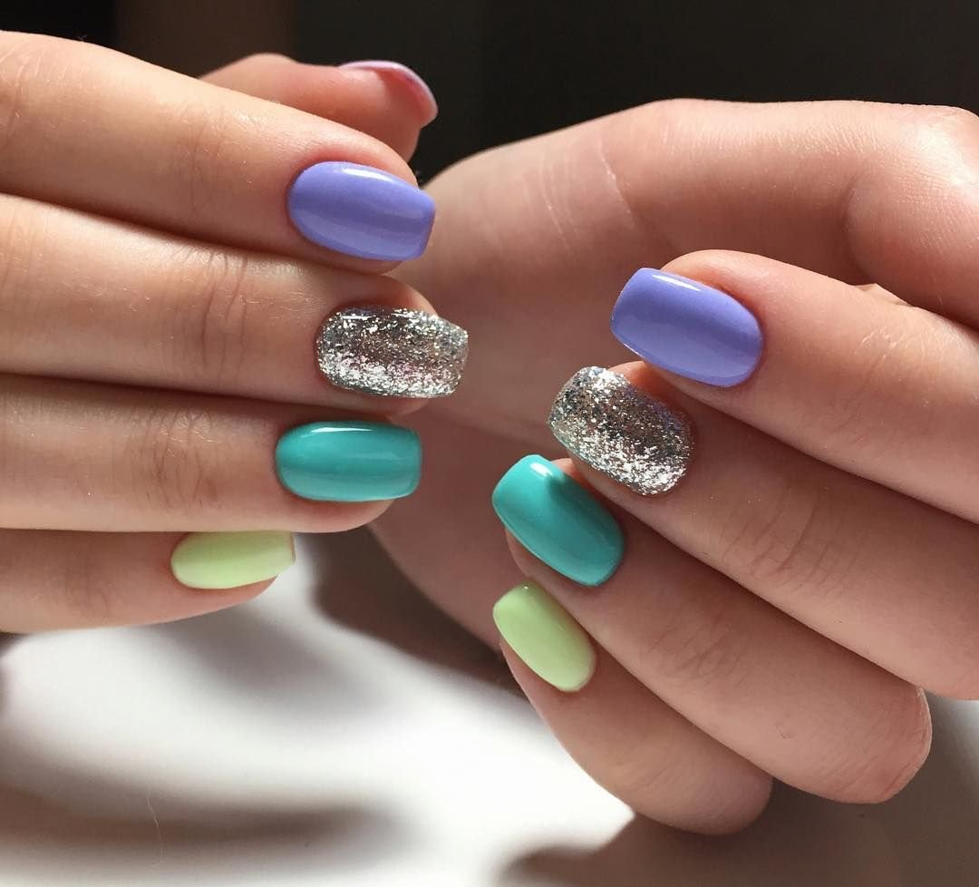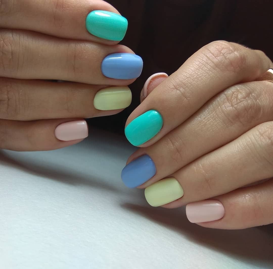 Для смелых и активных предлагаем новый тренд сезона для стильного маникюра — все ноготки разных цветов словно яркие конфетки. Если такой эффект слишком активен для повседневного маникюра, сделайте дизайн более спокойным, используя пастельные оттенки лака. Другой вариант — взять за основу один цвет и оформить ноготки в разные тона.