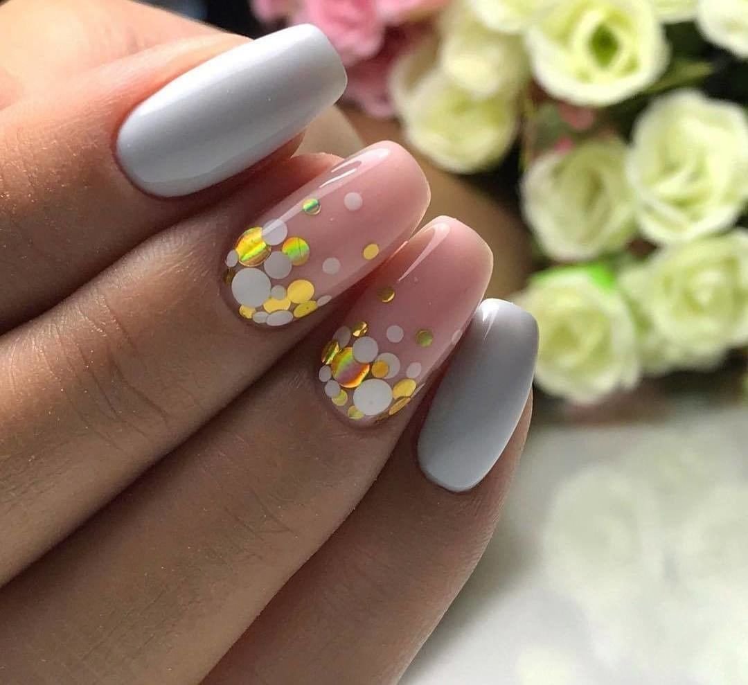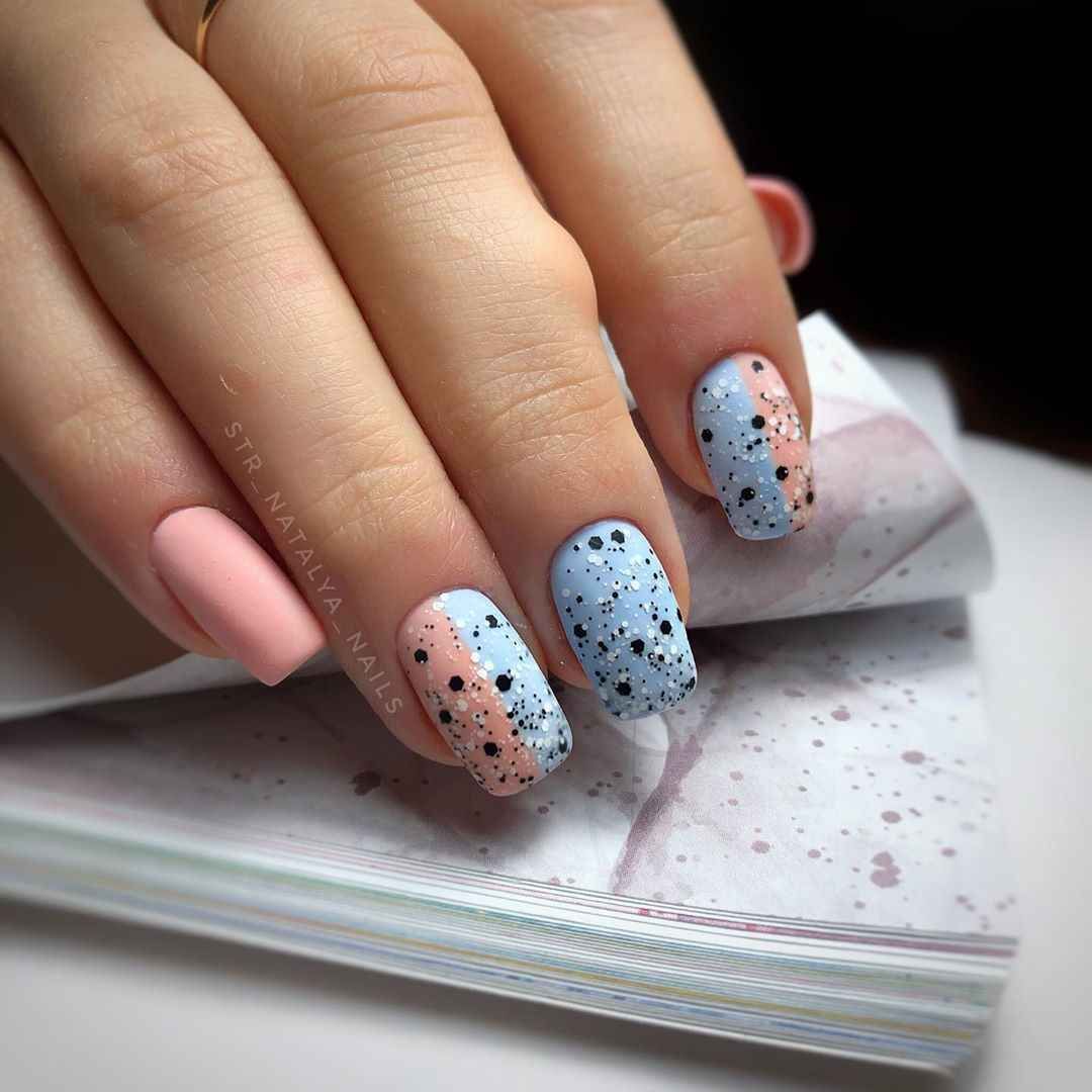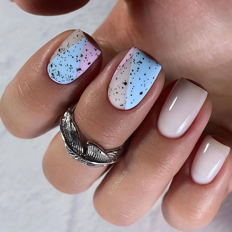 Удивительно, но дизайн перепелиное яйцо находится на пике популярности уже не первый сезон. Как правило, его делают в пастельных тонах. А чтобы он был максимально стильным используют матовый топ. Не стоит думать, что такой декор нельзя сочетать с другими. Для украшения подойдут стразы, паутинка, блестки и даже геометрический рисунок.