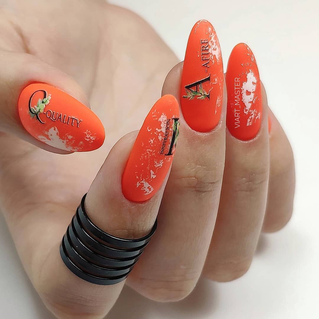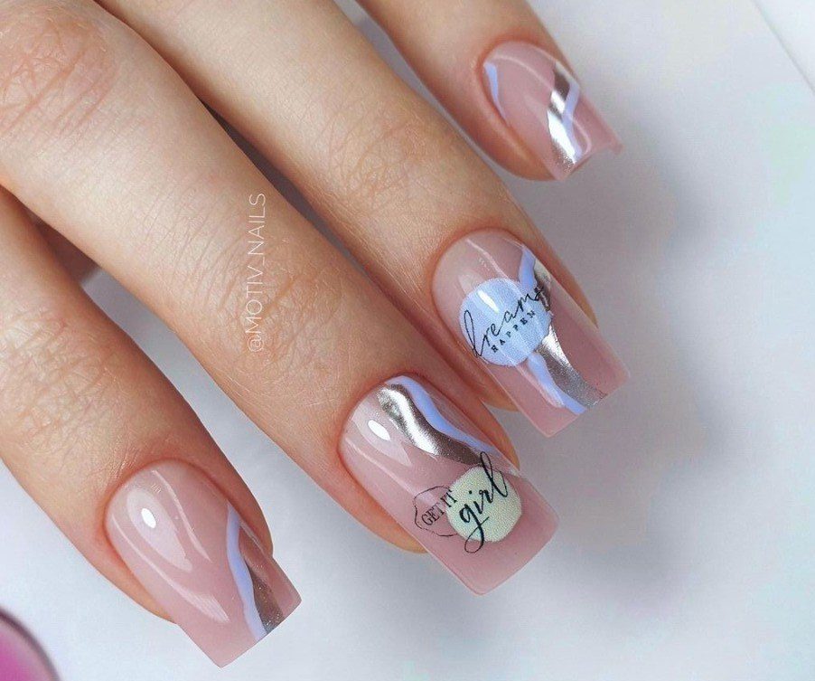 Надписи актуальны в этом сезоне при создании стильного маникюра. Тексты могут быть любыми, но не стоит обращать внимание на нецензурные выражения или провокационные слоганы. Надписи отлично сочетаются с эффектом мрамора, перепелиного яйца, матовым топом или паутинкой.