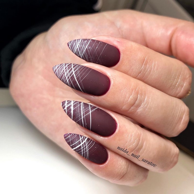 Паутинка — дизайн, который под силу сделать самостоятельно. Он может быть основным или дополнить любой другой из перечисленных выше дизайнов. Тонкие линии паутинки могут быть контрастными или в тон, серебристыми или золотыми. Если выбираете глянцевую базу, паутинка должна быть как можно более заметной. А вот на матовой подойдет любая. Тонкие линии можно дополнить небольшими стразами — словно блестящие росинки в паутине на траве.