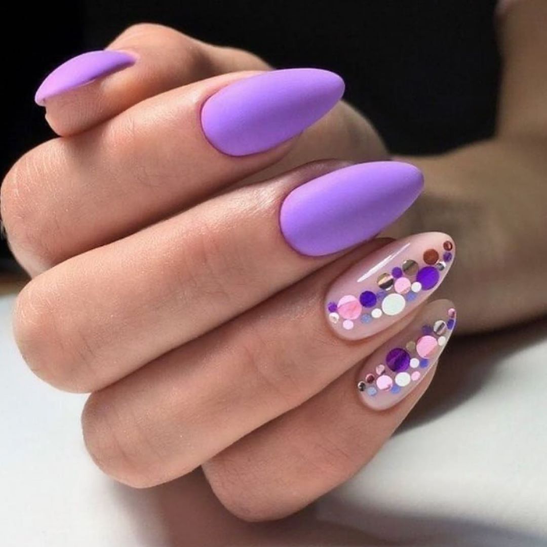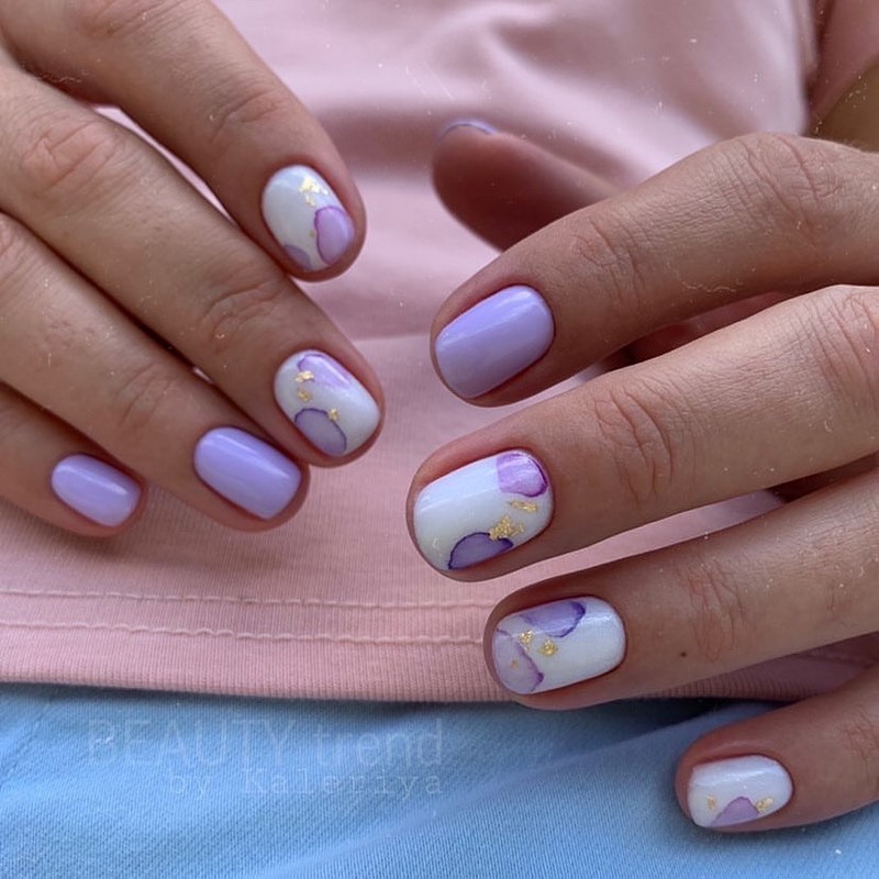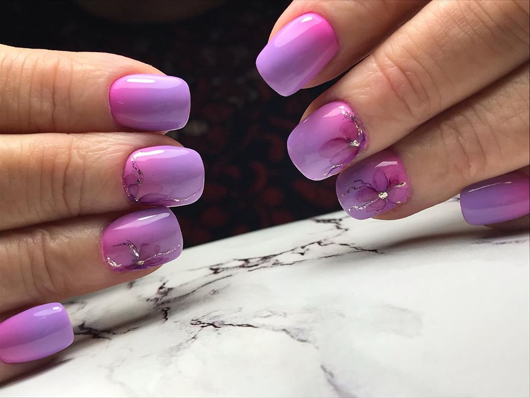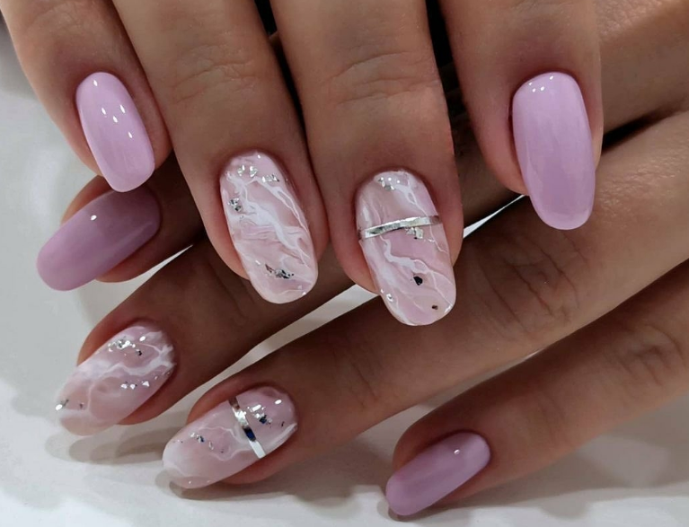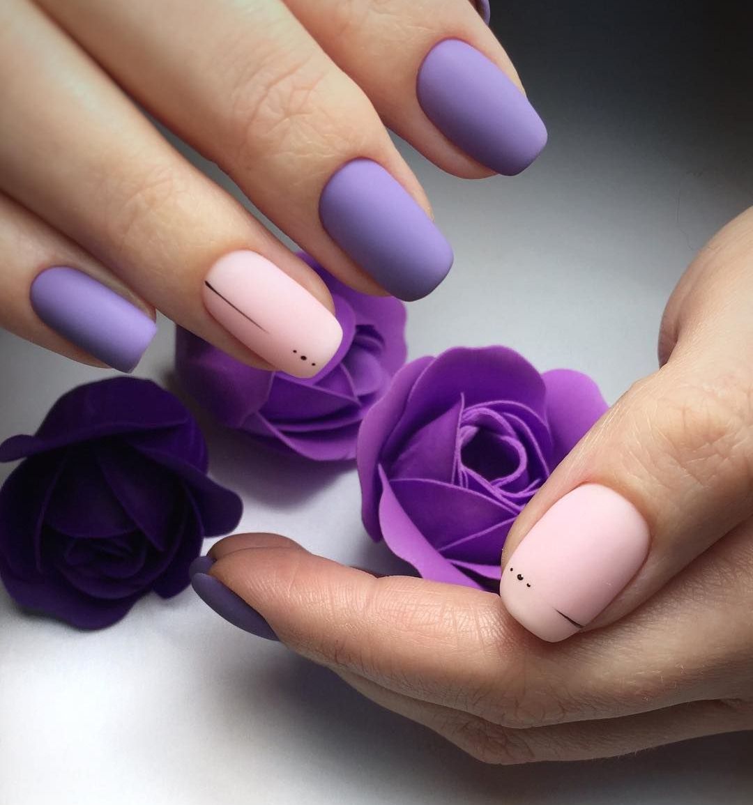 - сиреневый. Это яркий и жизнерадостный оттенок, напоминающий о весне и пьянящем аромате сирени. Сюда же можно отнести и лавандовый маникюр. Разница в оттенках состоит в том, что в лавандовом больше розового подтона;