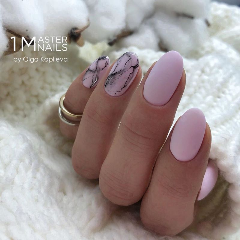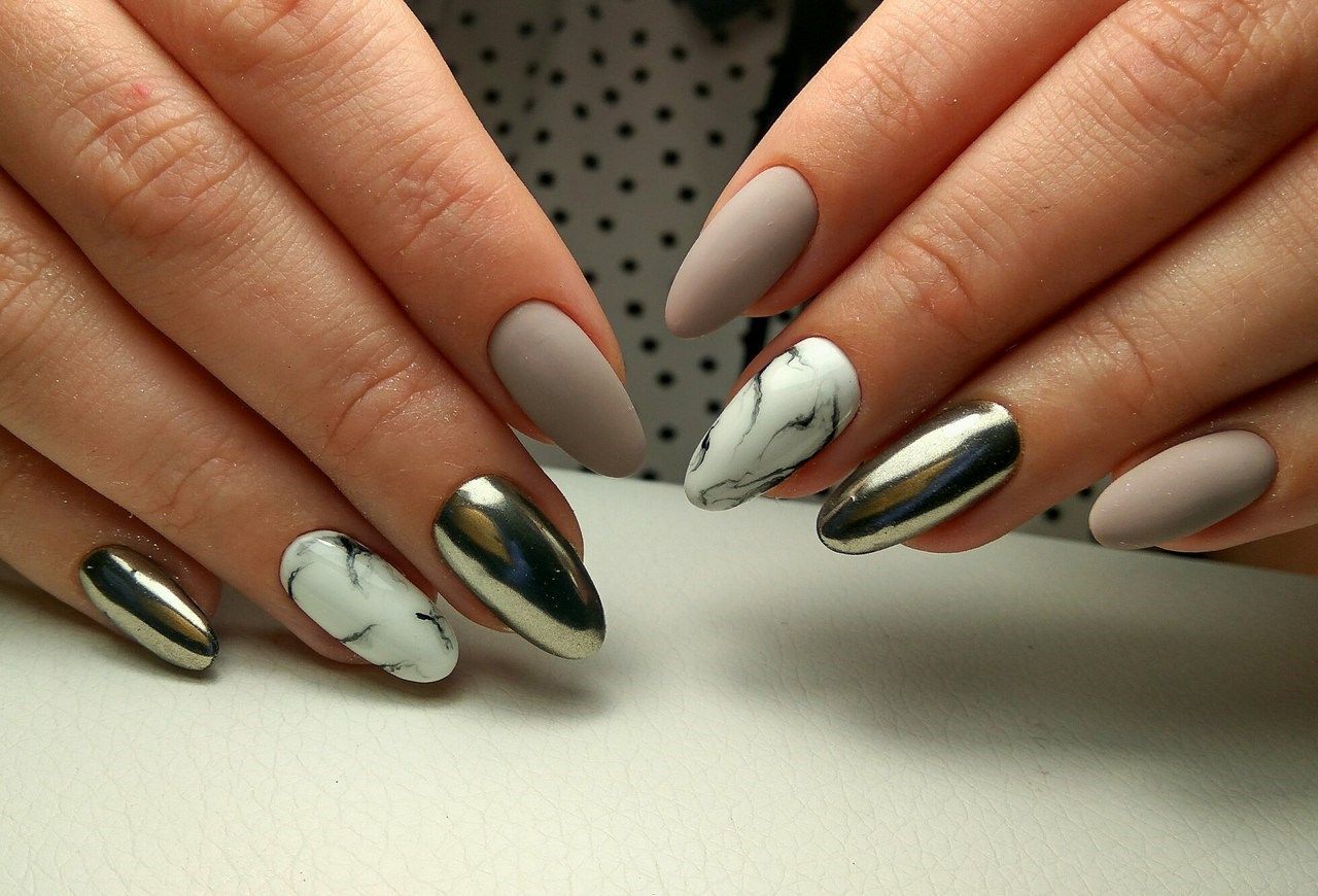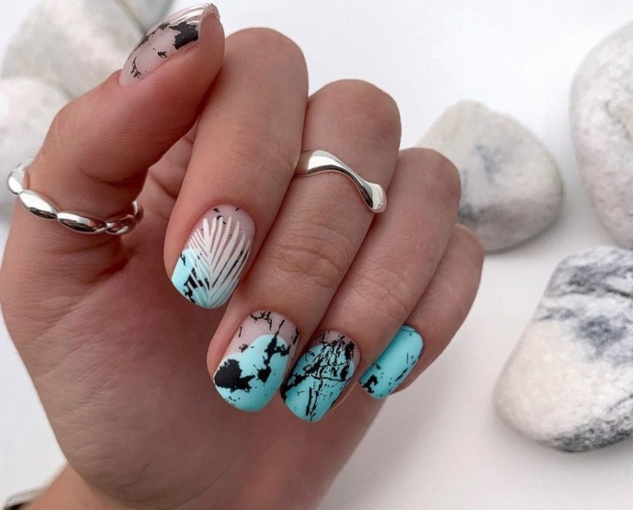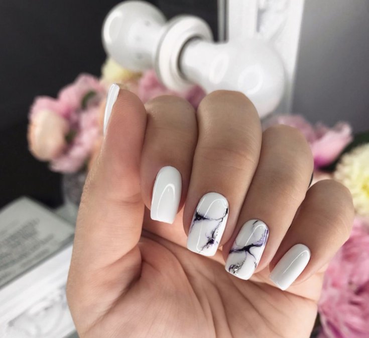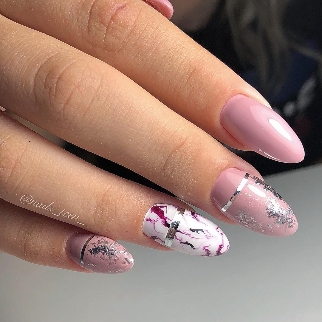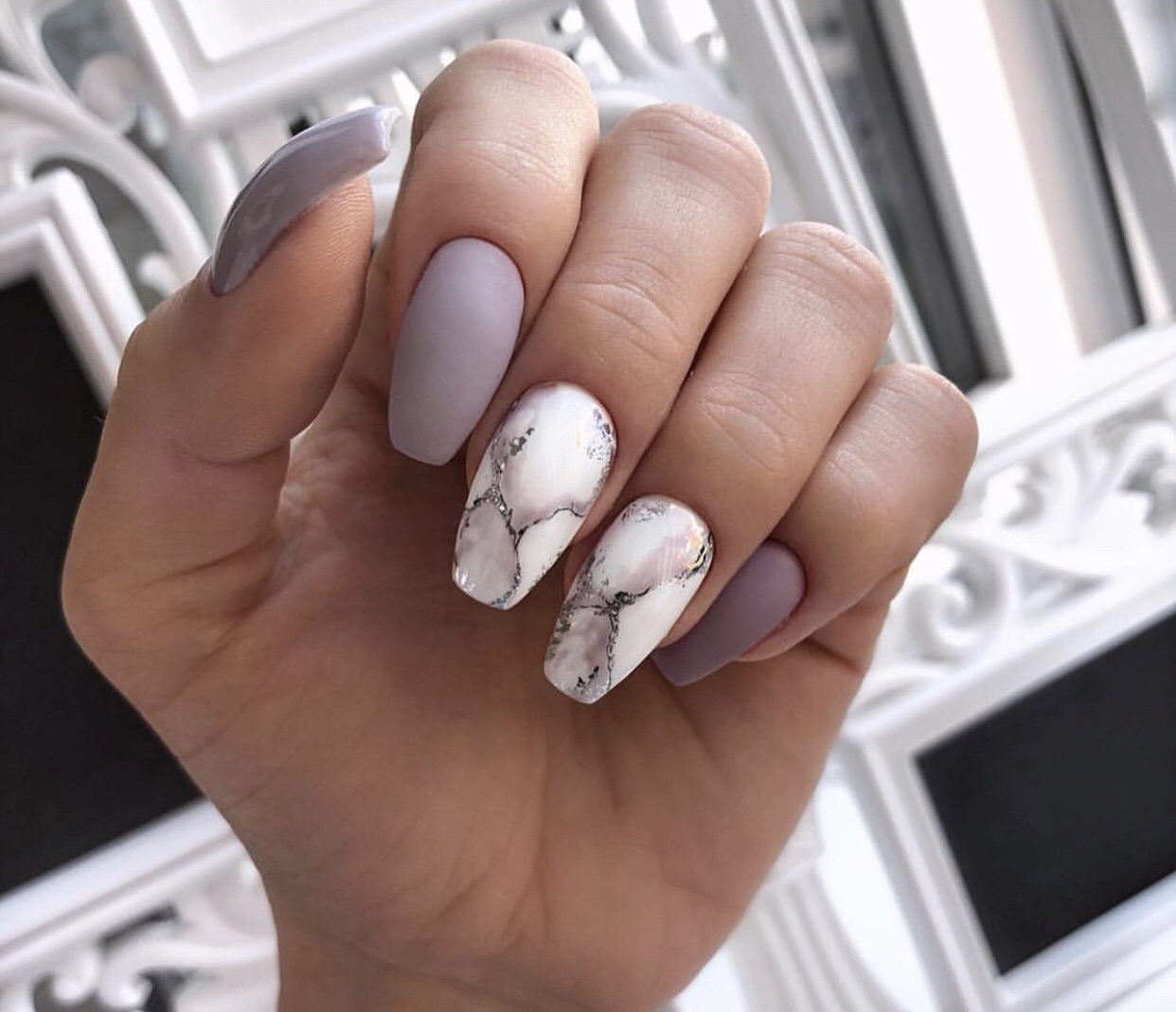 Эффект камня на ногтях — загадочно, стильно и очень модно. Не обязательно создавать природную текстуру. Вы можете использовать любые оттенки лака. Для стильного маникюра не нужно оформлять мрамором все ноготки. Достаточно всего одного или двух акцентов. Кроме того, дизайн можно дополнить матовым топом. Эффектно смотрится фольга, которая позволит сделать небольшой, но запоминающийся акцент в маникюре. Для яркого акцента можно использовать глиттер или стразы.