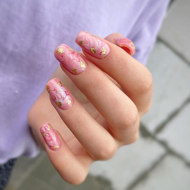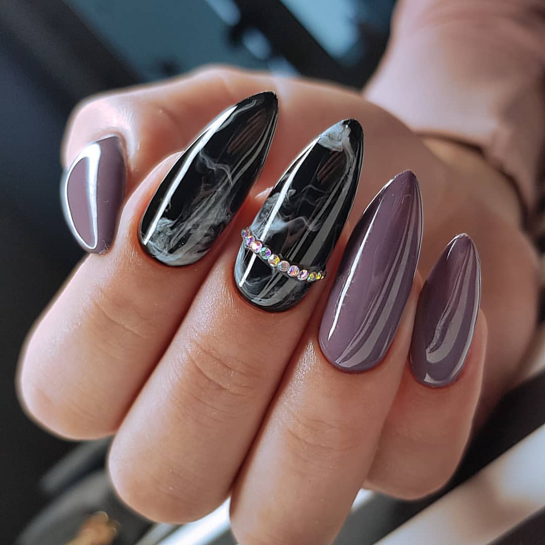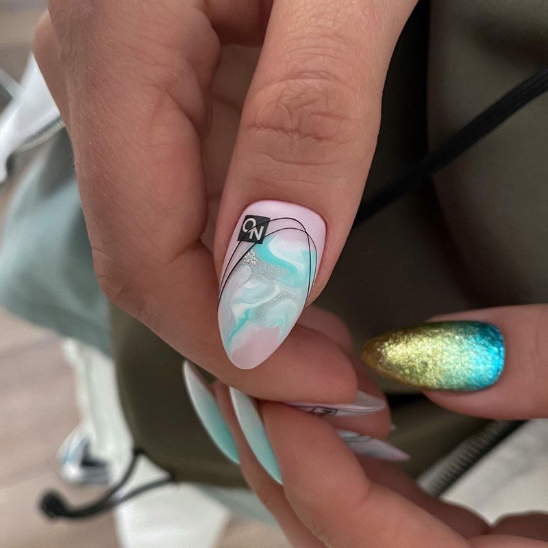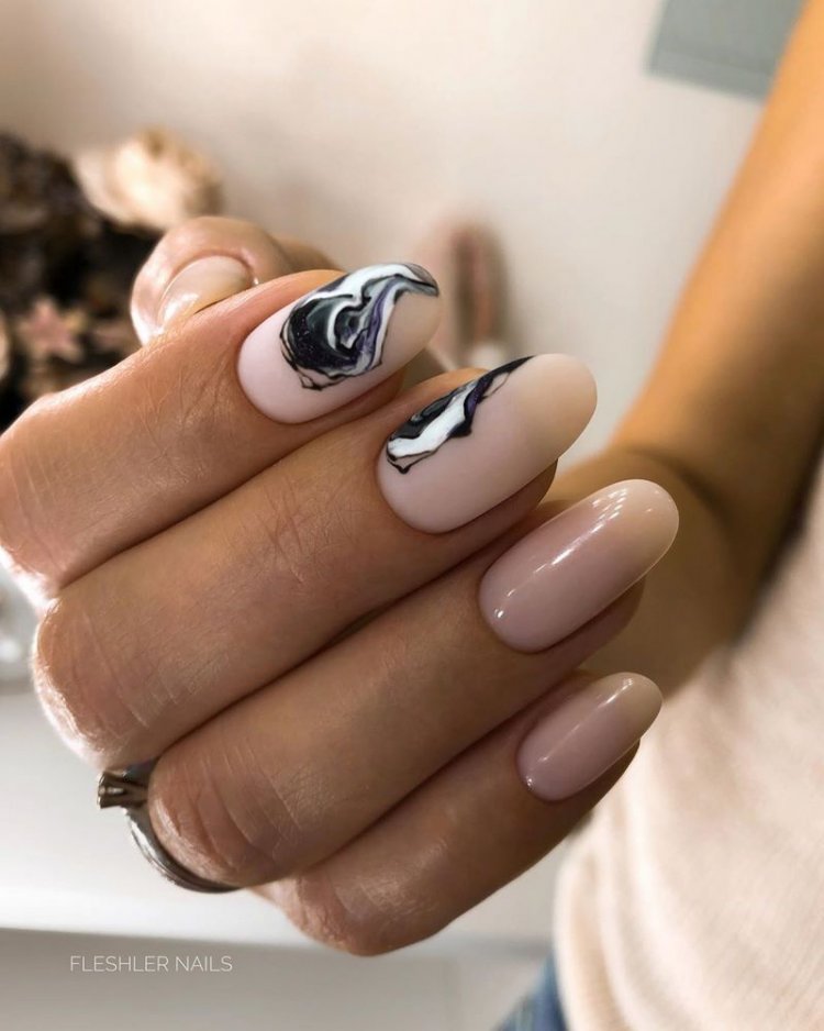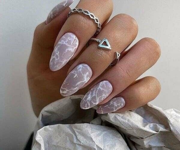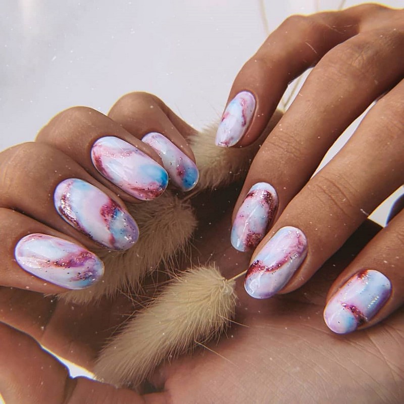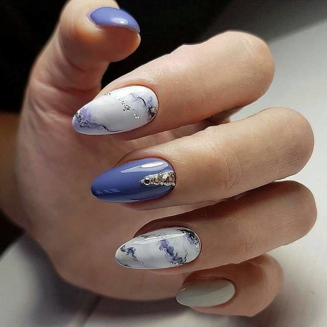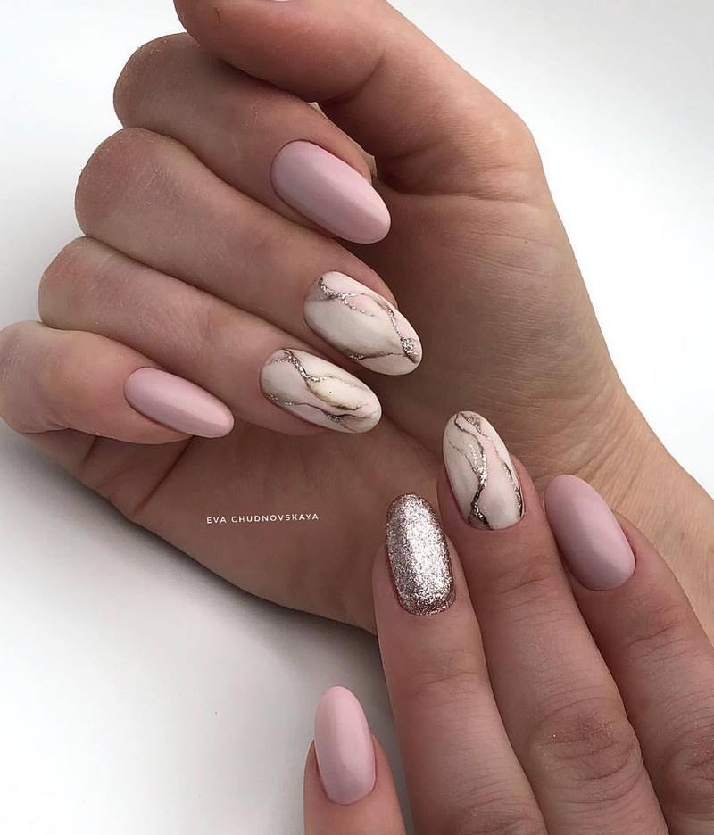 Эффект камня на ногтях — загадочно, стильно и очень модно. Не обязательно создавать природную текстуру. Вы можете использовать любые оттенки лака. Для стильного маникюра не нужно оформлять мрамором все ноготки. Достаточно всего одного или двух акцентов. Кроме того, дизайн можно дополнить матовым топом. Эффектно смотрится фольга, которая позволит сделать небольшой, но запоминающийся акцент в маникюре. Для яркого акцента можно использовать глиттер или стразы.