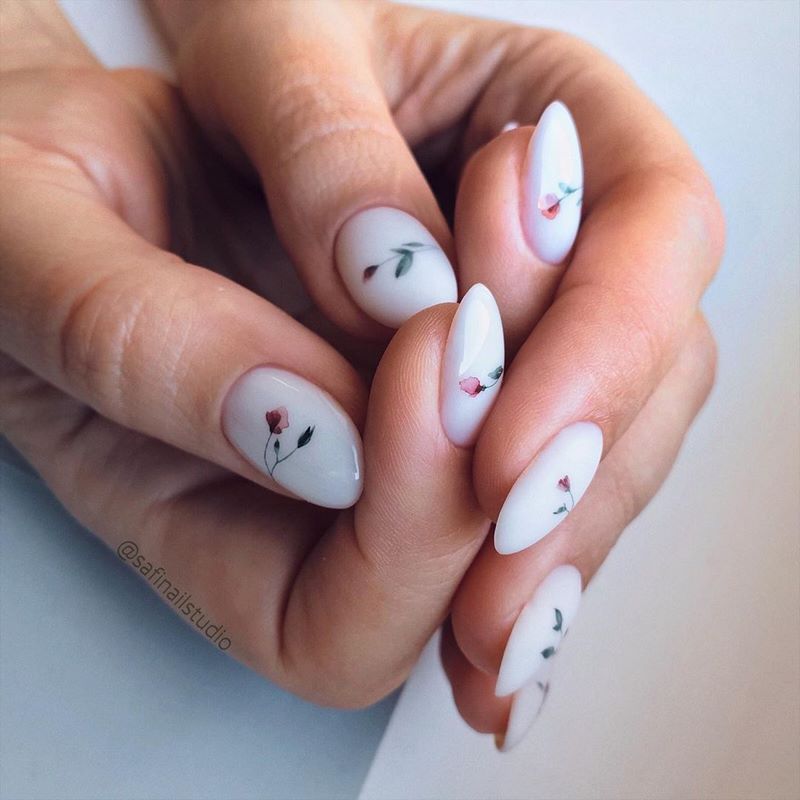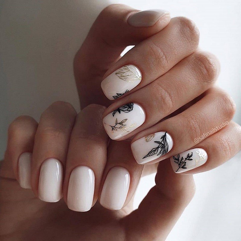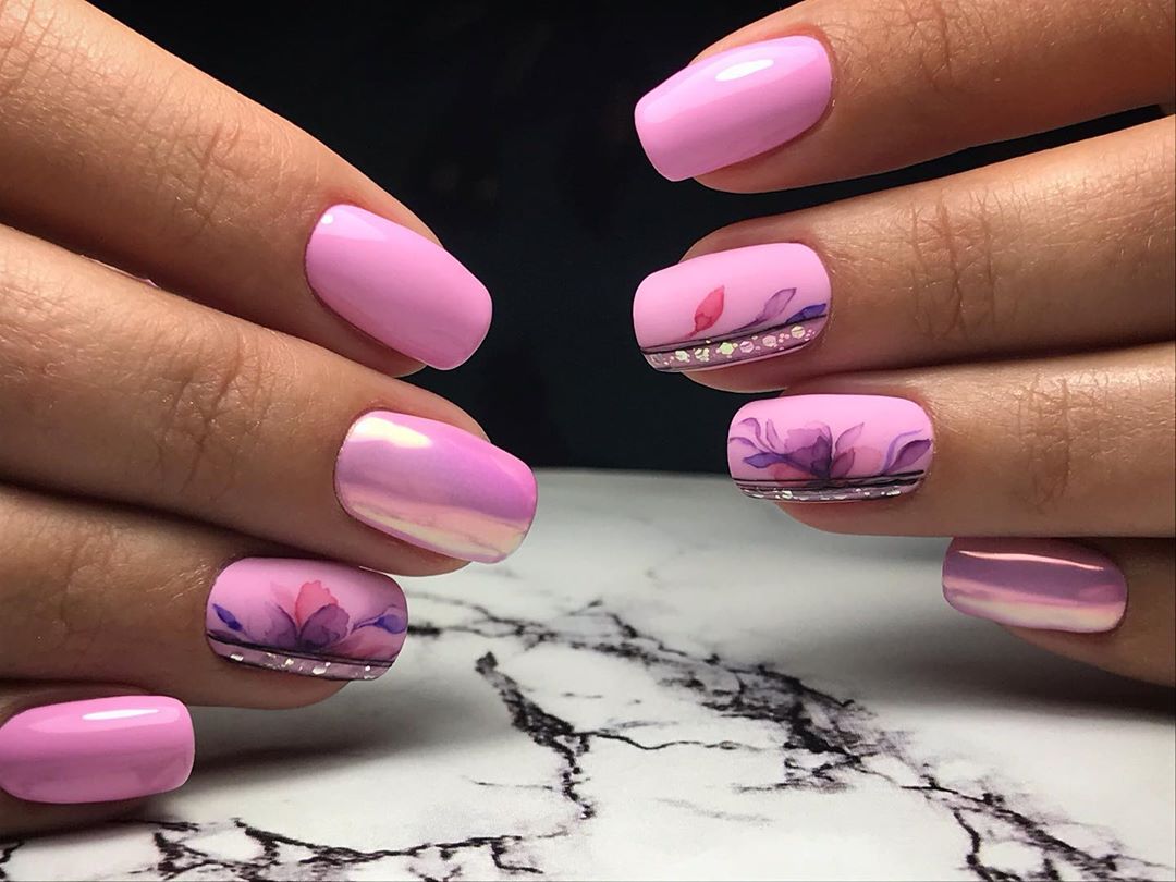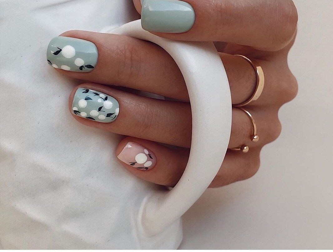 Рисунки в маникюре — любовь девушек по всему миру. Их можно нарисовать кистью, нанести с помощью техники стемпинга или наклеек, трафаретов. В этом сезоне особенно модными считаются акварельные рисунки, мазки краски, чернильные разводы. В каждом сезоне актуальны свои варианты рисунков. Но чаще всего модницы выбирают флористические мотивы — веточки, цветы, листья и др.