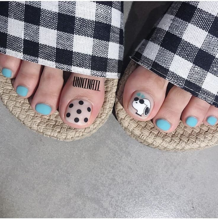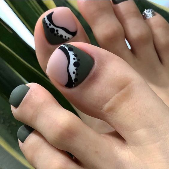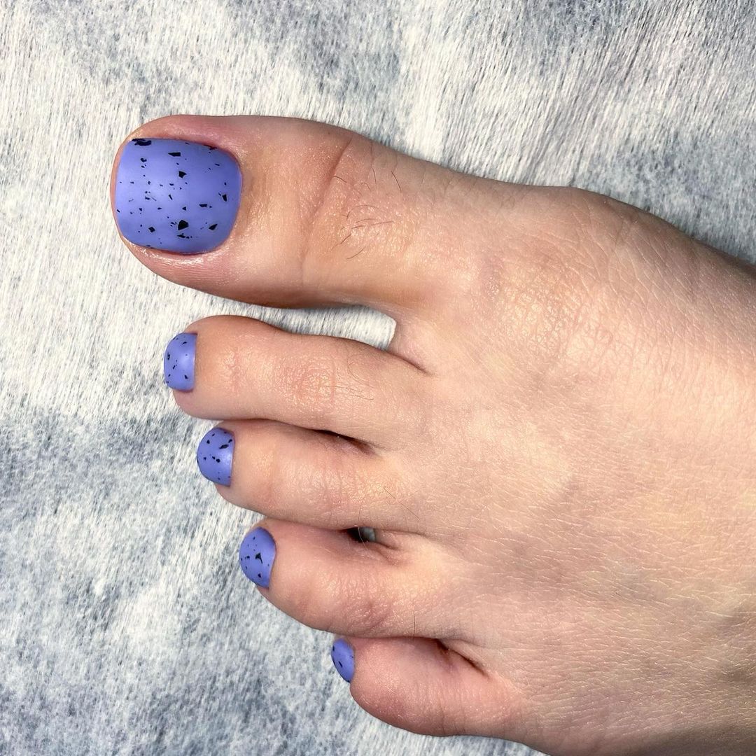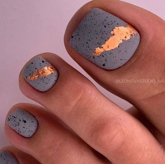 Простой и одновременно стильный пятнистый дизайн ногтей, который очень сильно похож на скорлупу перепелиного яйца. Он стал популярен несколько сезонов назад и каждый год все еще оказывается в трендах. Самым популярным оттенком для создания стильного педикюра станет теплый, бежевый. Это база. Точки вы можете нарисовать любым оттенком. Главное, чтобы они были разного размера, с неровными краями и разбросаны хаотично по поверхности ногтя. Но в качестве базы вы можете использовать любой другой оттенок. Здесь нет никаких строгих правил и не обязательно повторять текстуру перепелиного яйца досконально.