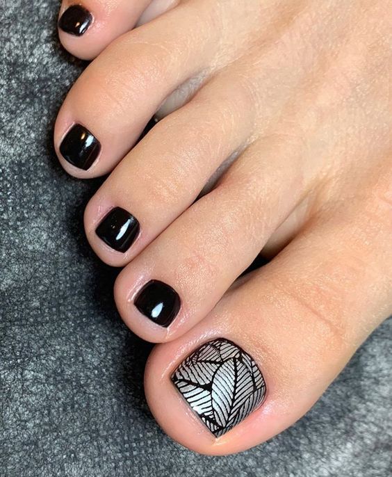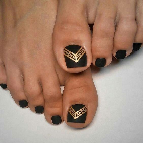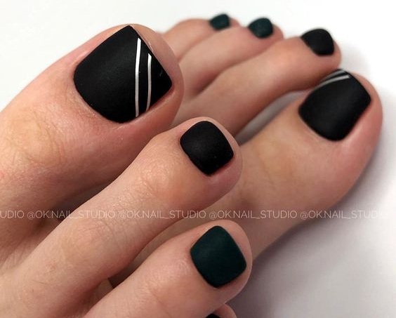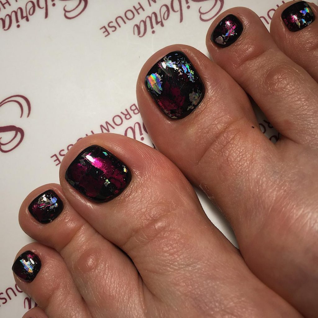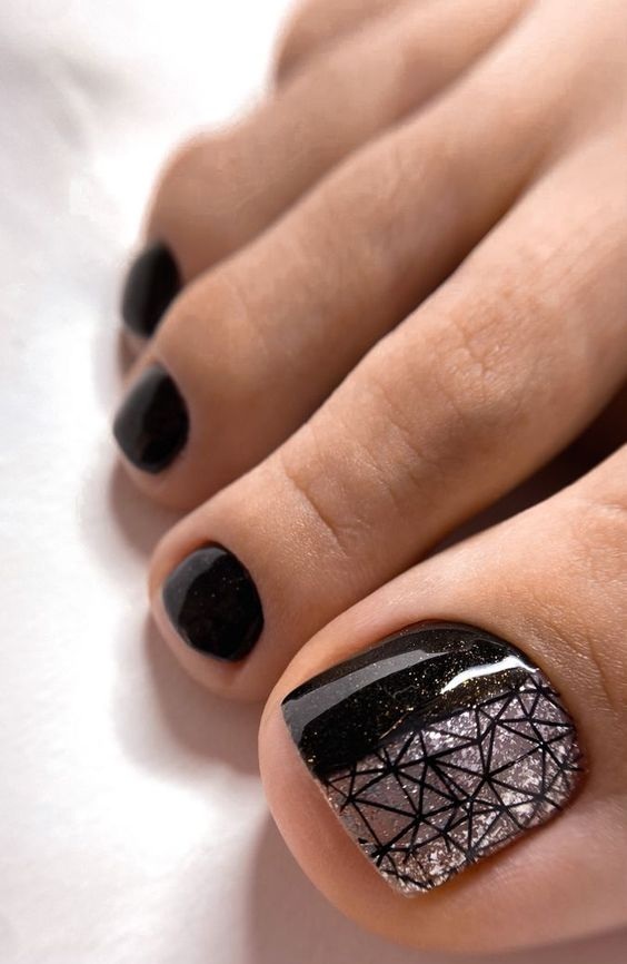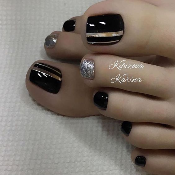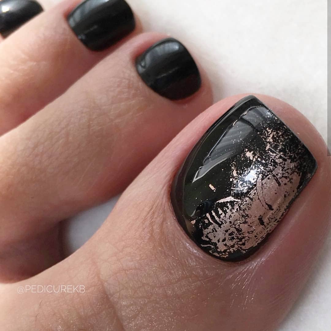 Еще одна бесспорная классика, от которой многие женщины по какой — то причине отказываются. Часть из них считают, что педикюр с черным лаком будет выглядеть слишком мрачно. Это не так. Черный лак не просто позволяет создать стильный педикюр, но является всесезонным оттенком. Кроме того, он отлично вписывается в образ с любым цветом открытой обуви. Черные обязательно добавит образу элегантности и дерзости. Если простой черный оттенок кажется вам слишком скучным, попросите мастера покрыть его сверху светоотражающим топом.