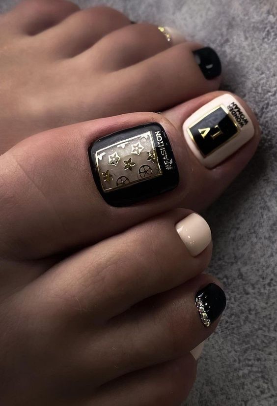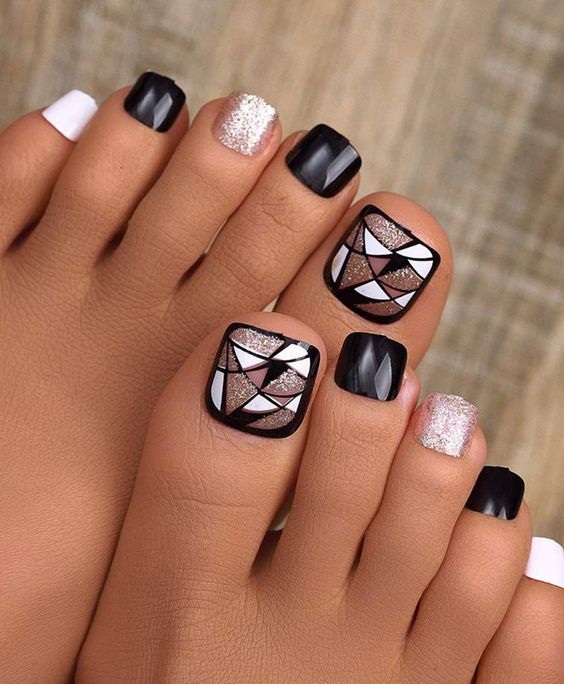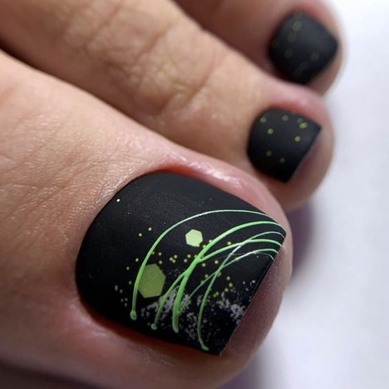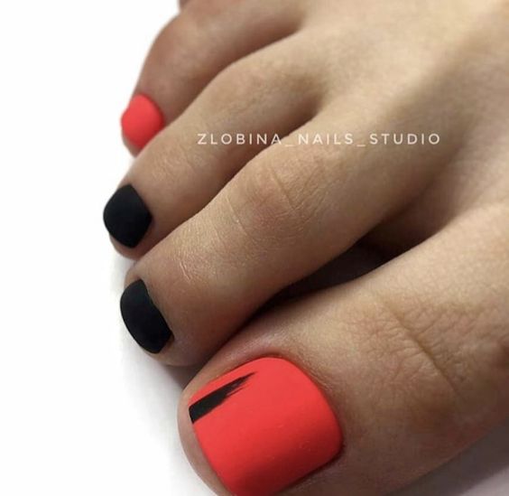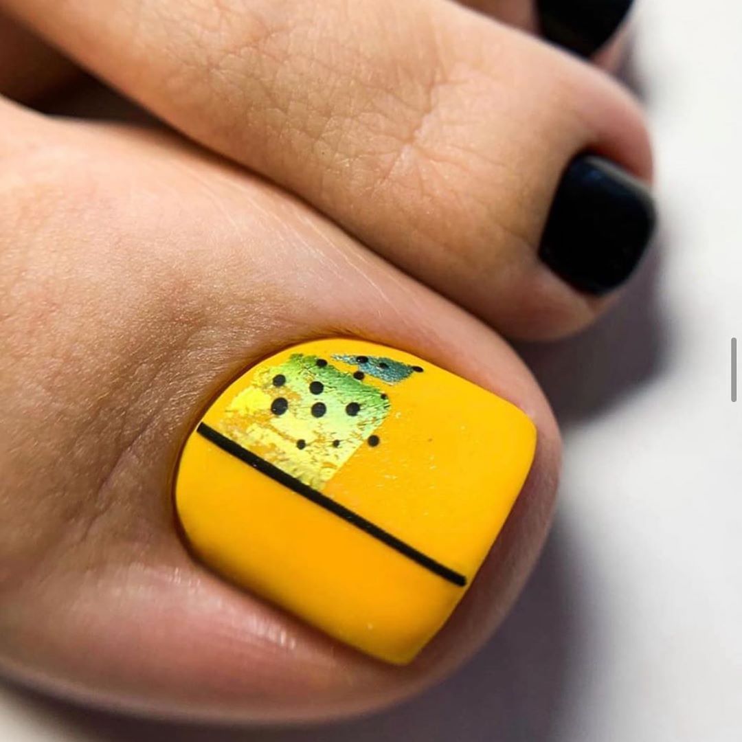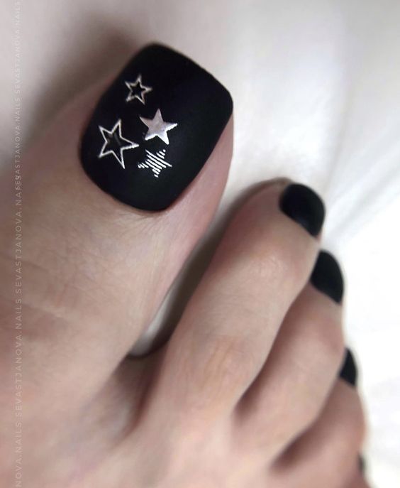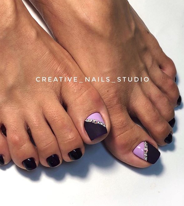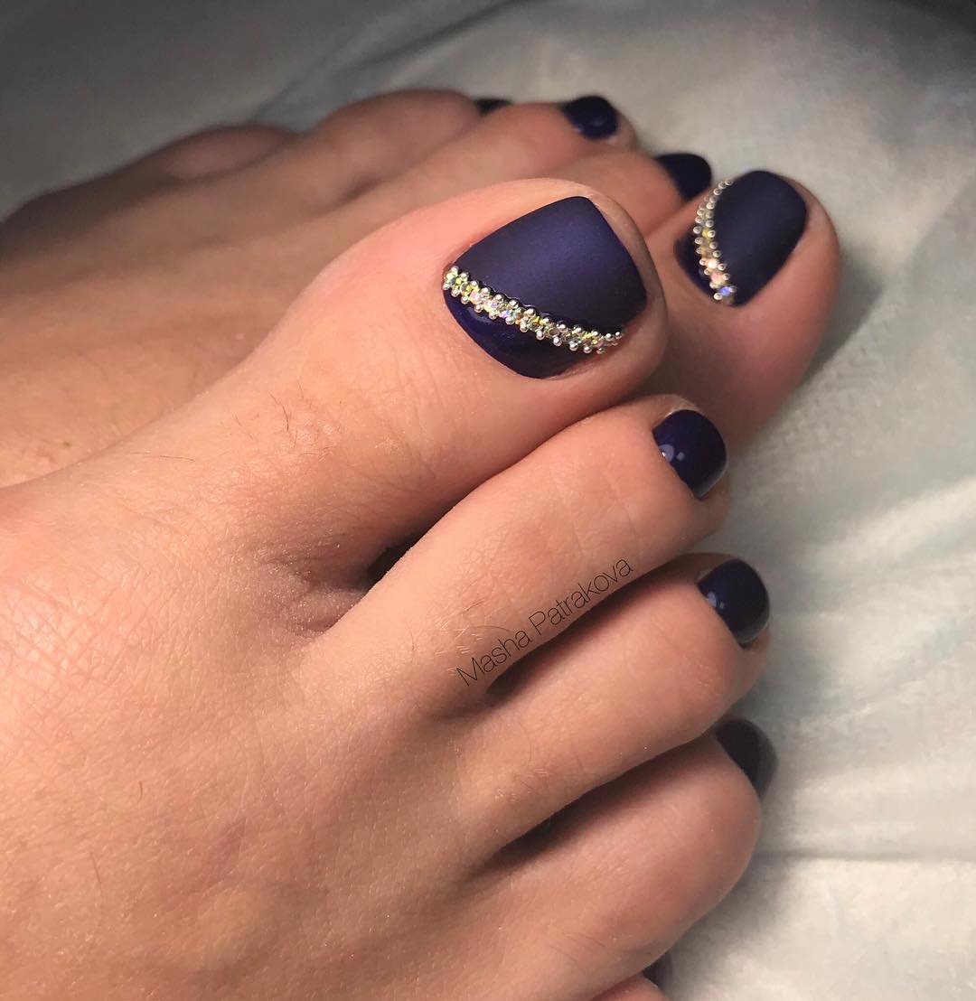 Еще одна бесспорная классика, от которой многие женщины по какой — то причине отказываются. Часть из них считают, что педикюр с черным лаком будет выглядеть слишком мрачно. Это не так. Черный лак не просто позволяет создать стильный педикюр, но является всесезонным оттенком. Кроме того, он отлично вписывается в образ с любым цветом открытой обуви. Черные обязательно добавит образу элегантности и дерзости. Если простой черный оттенок кажется вам слишком скучным, попросите мастера покрыть его сверху светоотражающим топом.
