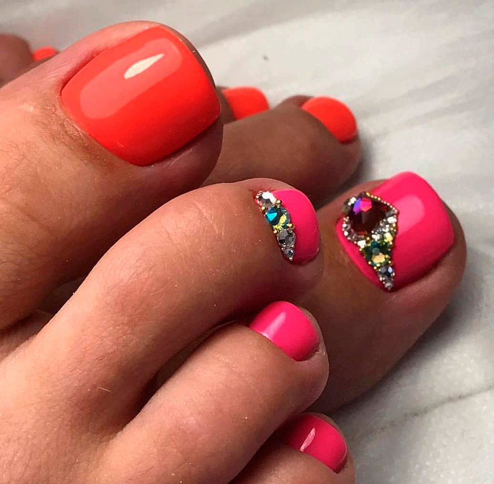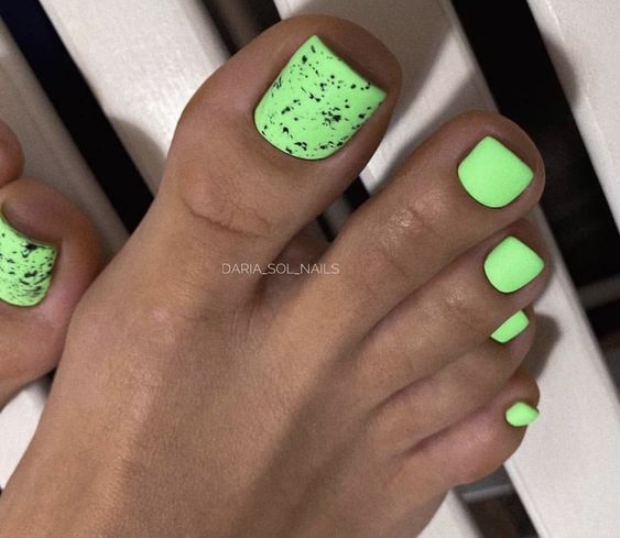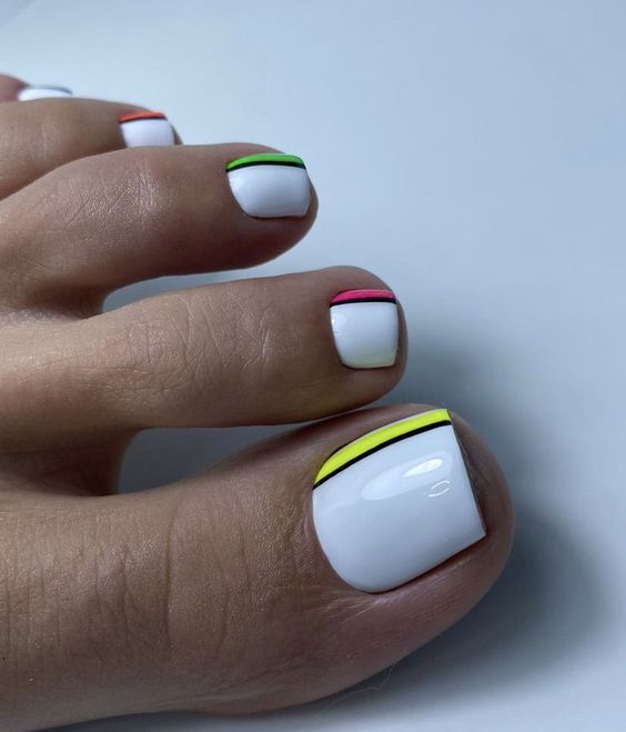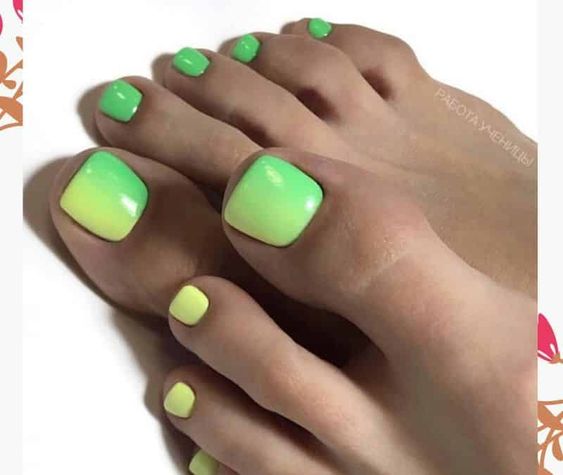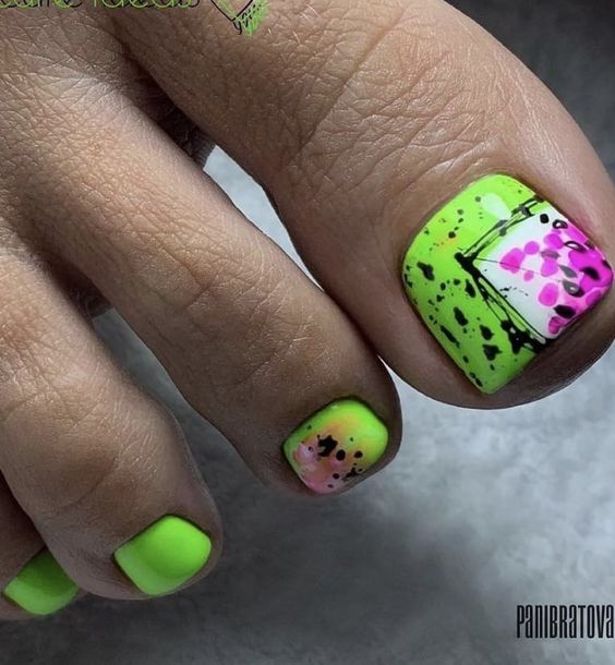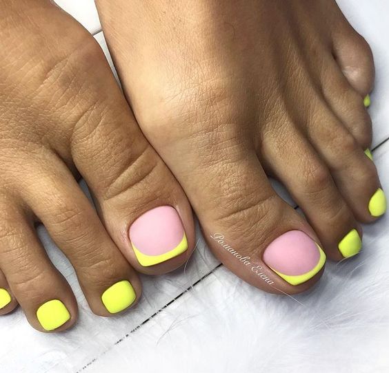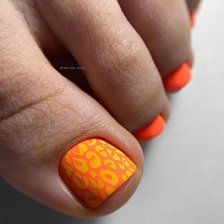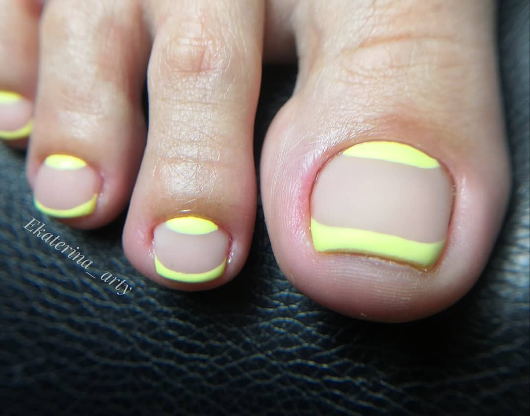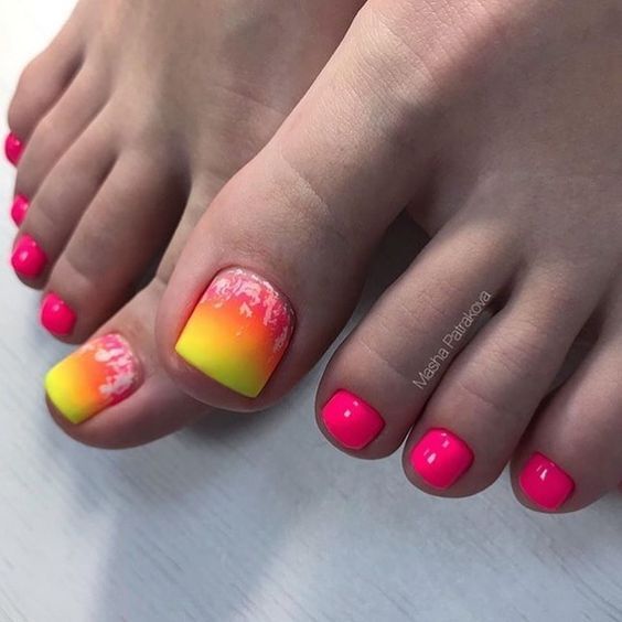 Когда как не летом использовать неоновые лаки для создания стильного педикюра. Довольно часто неоновые оттенки попадают в немилость мастеров и модниц. Считается, что маникюр — педикюр, в котором они использованы, будет пошлым и чрезмерным. Но только не в этом сезоне. Не бойтесь быть дерзкими и смелыми. Особенно эффектно — неоновые оттенки смотрятся на загорелой кожи ног. Самыми эффектными считаются неоновый, розовый, оранжевый и желтый.