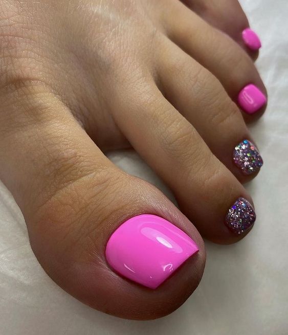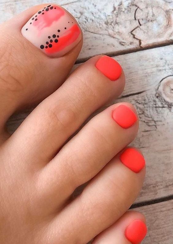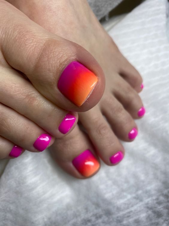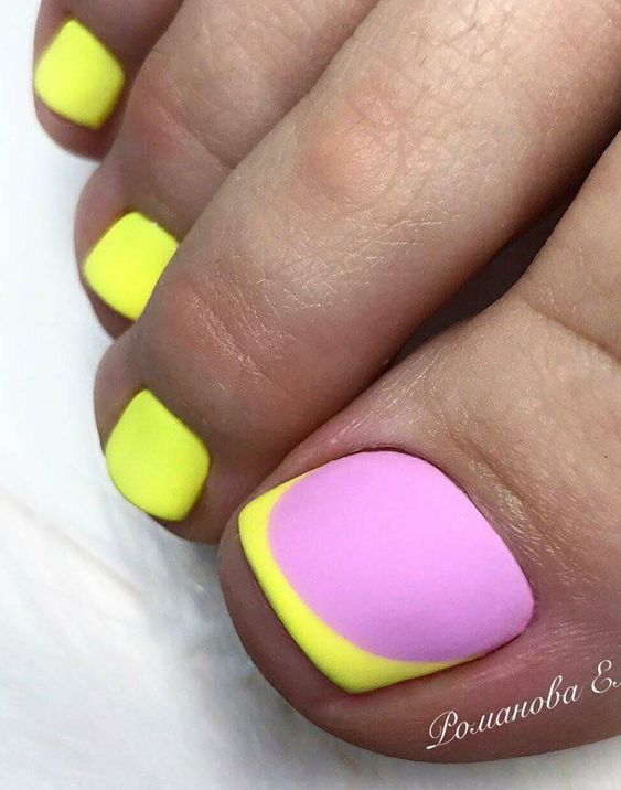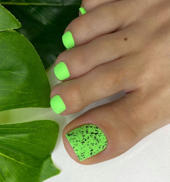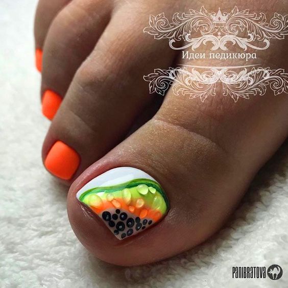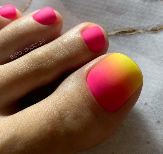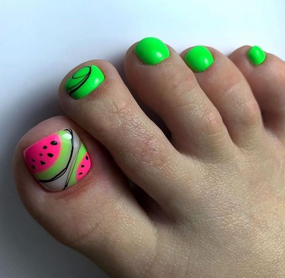 Когда как не летом использовать неоновые лаки для создания стильного педикюра. Довольно часто неоновые оттенки попадают в немилость мастеров и модниц. Считается, что маникюр — педикюр, в котором они использованы, будет пошлым и чрезмерным. Но только не в этом сезоне. Не бойтесь быть дерзкими и смелыми. Особенно эффектно — неоновые оттенки смотрятся на загорелой кожи ног. Самыми эффектными считаются неоновый, розовый, оранжевый и желтый.