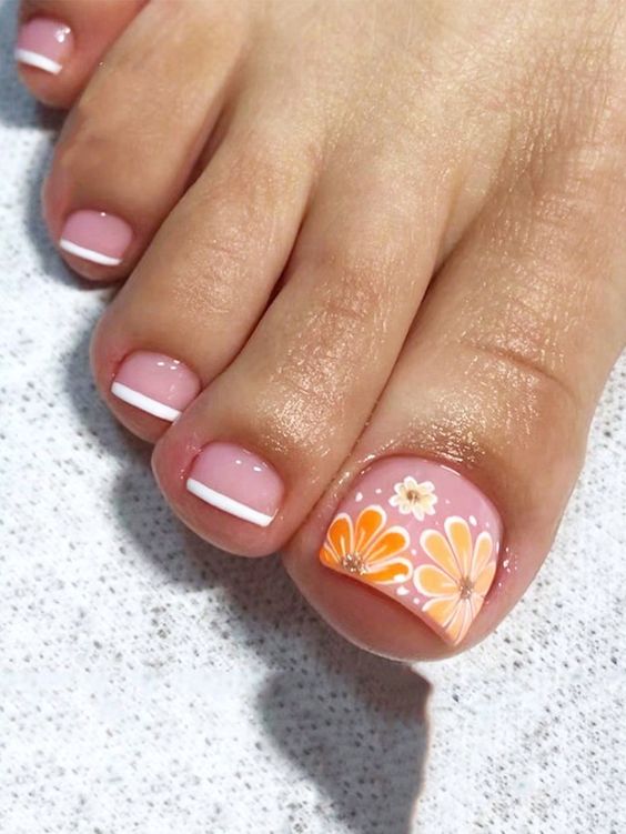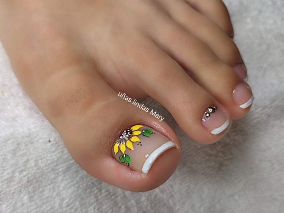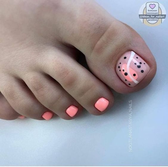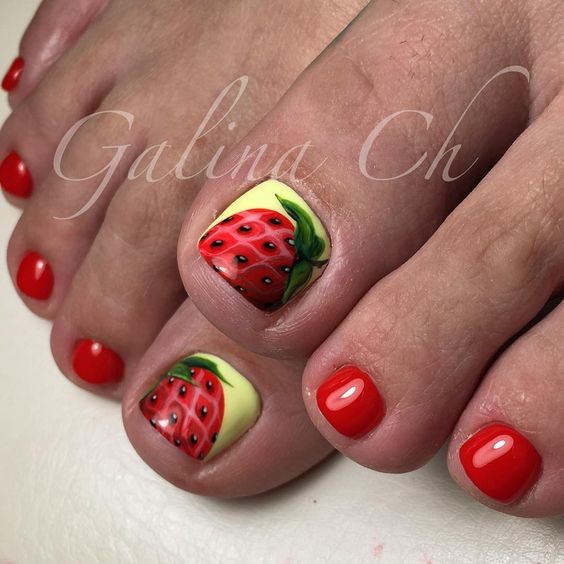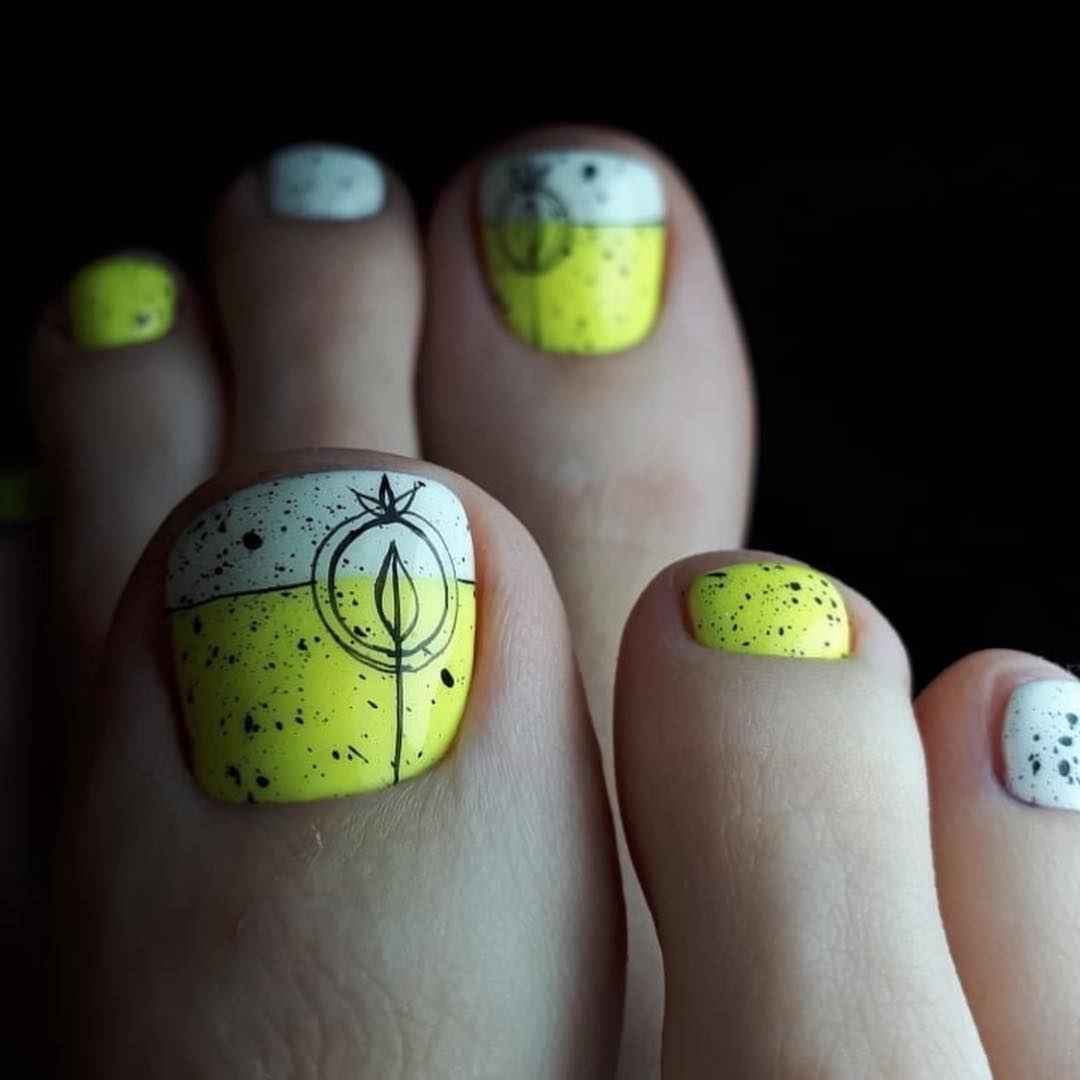 Рисунок — это отличный вариант, если вы хотите создать не просто стильный, но еще и уникальный педикюр. С помощью обычного рисунка вы сможете выразить свое настроение и показать окружающим, что вы следите за модными трендами. Какой рисунок выбрать? Первое, на что стоит обратить внимание, это сезонность. Сколько разговоров о стильном педикюре актуальнее всего летом, обратим внимание на самые модные варианты рисунков именно в этот период. Самые трендовые — тема, лето — это флористические рисунки и фрукты. Как правило, таким образом украшают большой пальчик ноги. Можете нарисовать большой красивый цветок или ветку дольку сочного фрукта. А можно украсить россыпью мелких цветов. Например, ромашек. Актуальны также интересные надписи и милые забавные рисунки.