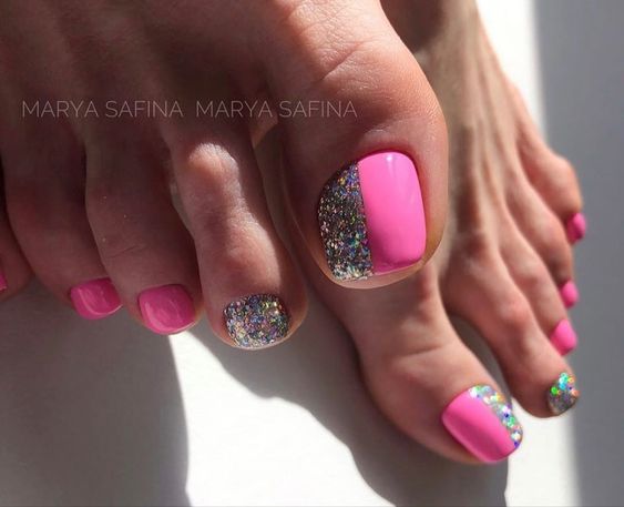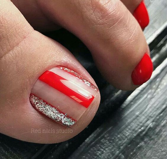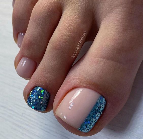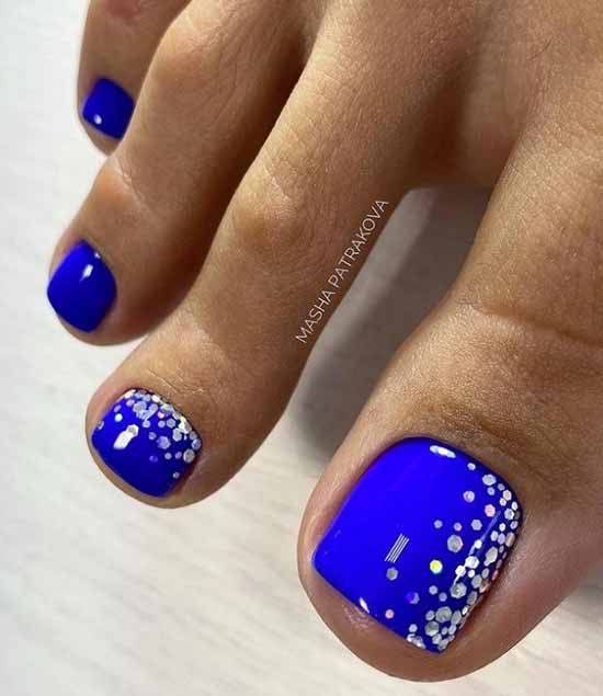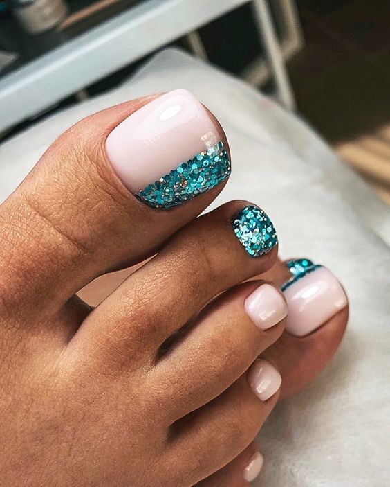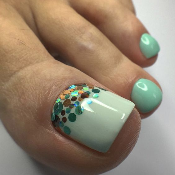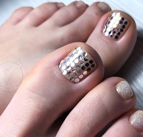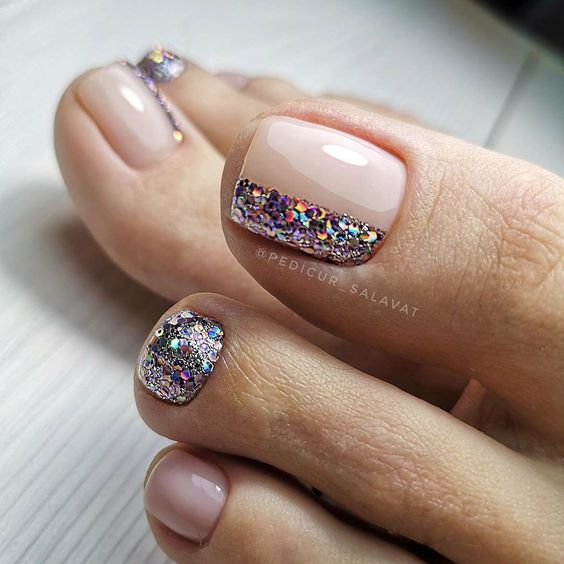 Выше мы говорили о том, что если вы хотите сделать стильный безопасный педикюр, то от страз лучше отказаться. Но иногда просто необходимо создать блестящий торжественный дизайн ногтей. Чтобы ножки очень красиво смотрелись в открытой обуви на каблуке. Добавить блеска помогут обычные блестки. Их легко комбинировать с любым лаком для ногтей и создавать самые разные дизайны. Самый простой вариант — это покрыть блестками всю пластину. Другой вариант — сделать дизайн с растяжкой блестками нанести их на пластину хаотично.