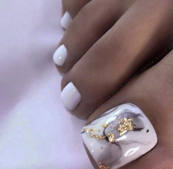 Абстракция — это отличный вариант, если вы хотите сделать стильный и довольно загадочный педикюр. Иногда достаточно несколько блестящих хаотичных мазков на ногтевой пластине. Чаще всего таким образом оформляют только большой палец, поскольку на остальных ноготках абстракции будет практически незаметной. Фантазируйте, и ваш педикюр всегда будет в центре внимания.