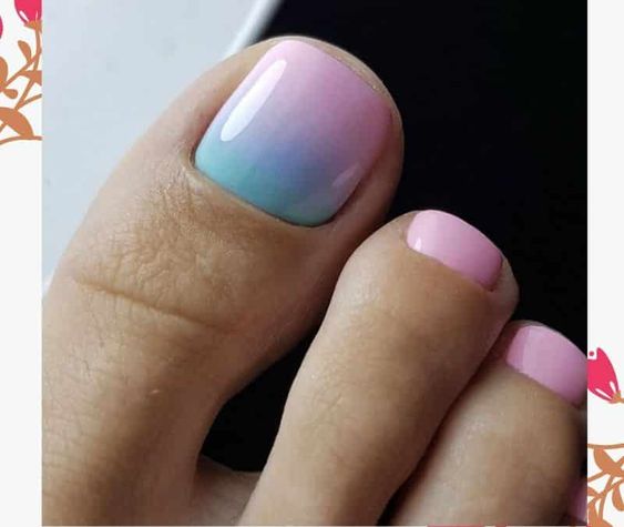 Отдельно скажем о таком тренде стильного педикюра, как разноцветность. Здесь для вас открывается огромное поле для экспериментов, особенно если вы обожаете буйство красок. Теплое время года разноцветный педикюр будет смотреться очень эффектно. Но старайтесь подбирать оттенки лака таким образом, чтобы они смотрелись на ножках гармонично и подходили вашему образу. Например, очень эффектно смотрится градиент из нескольких цветов. При этом лучше отдать предпочтение пастельной гамме.
