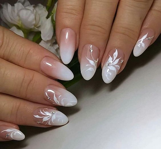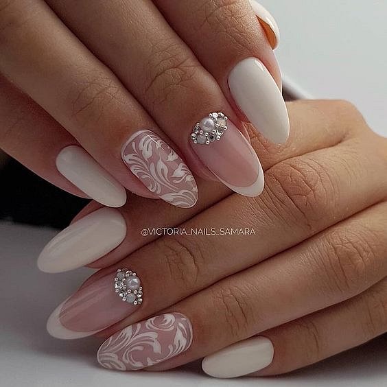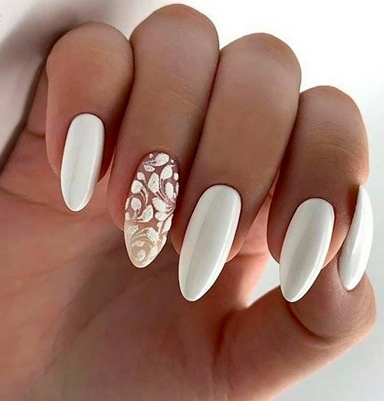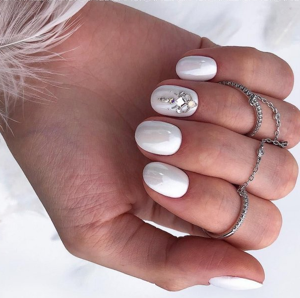 Традиционный цвет для свадьбы — символ чистоты, новой жизни и любви. Необязательно делать монохромный маникюр — белый цвет подойдет для выделений, рисунков, вензелей.