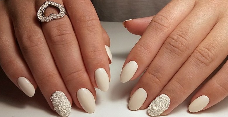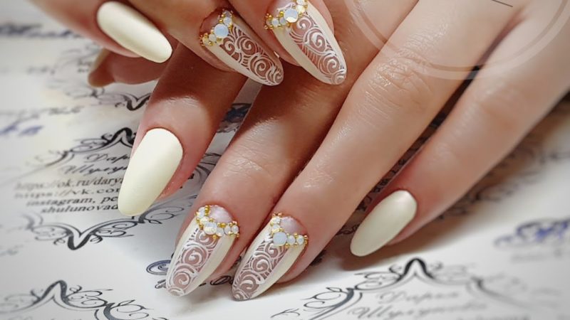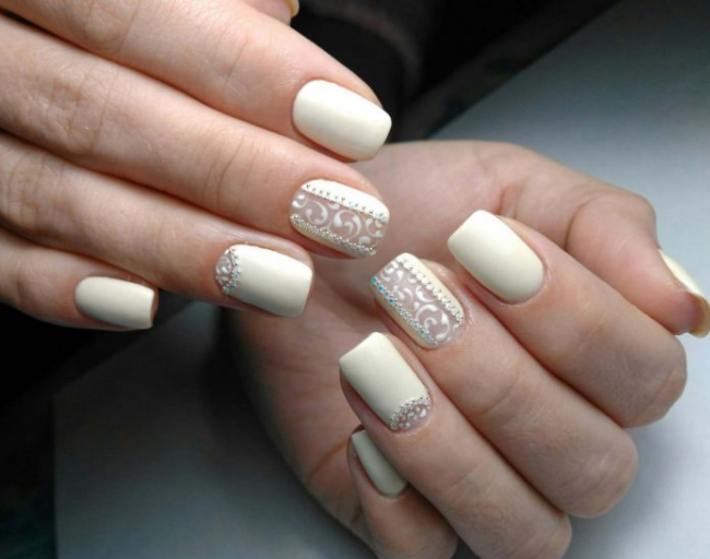 Молочный — отличная база для дизайна на свадьбу. Он станет универсальным фоном для любого декора — камни, блестки, рисунки, втирка. Не менее универсальны для невесты в день свадьбы и нюдовые тона — голубой, телесный, пыльная роза.