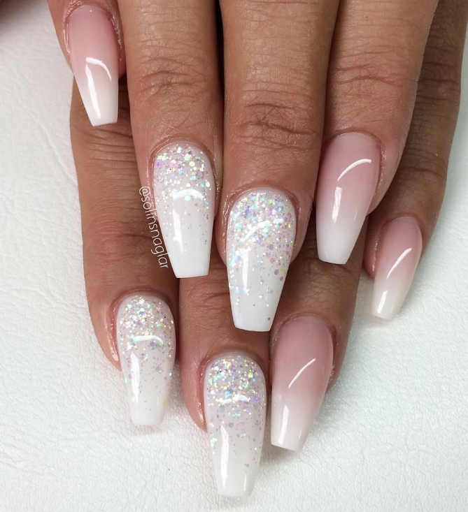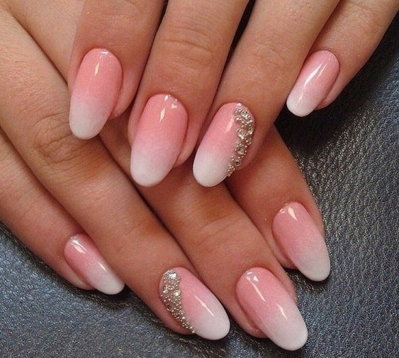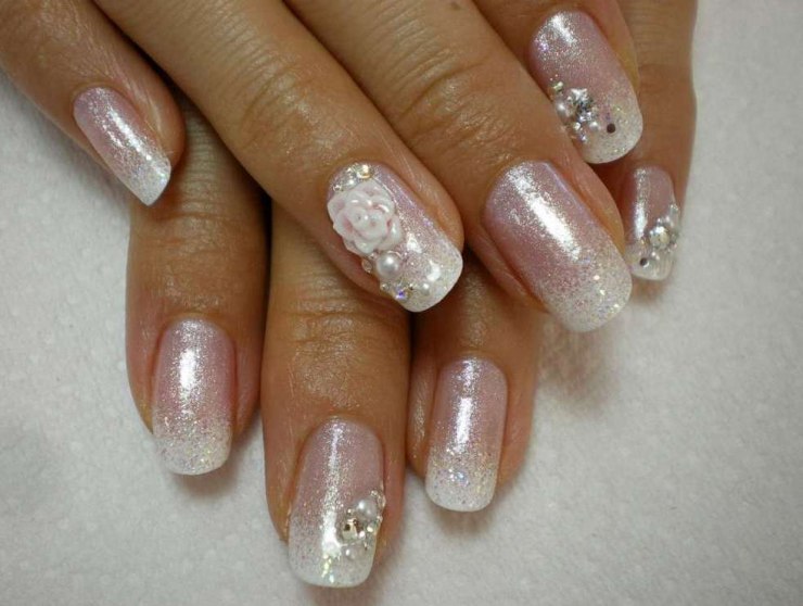 Конечно, короткая форма ногтей несколько ограничивает невесту в выборе дизайна. Традиционными для свадьбы считаются дизайны — френч, однотонное покрытие или омбре. А вот в качестве декора чаще всего невесты выбирают стразы, втирку или блестки.