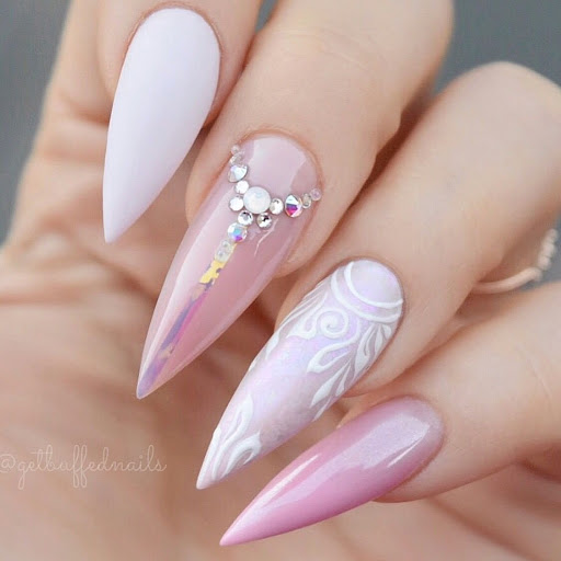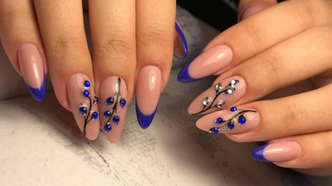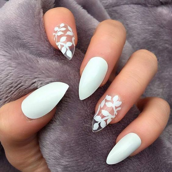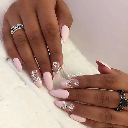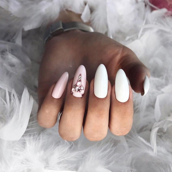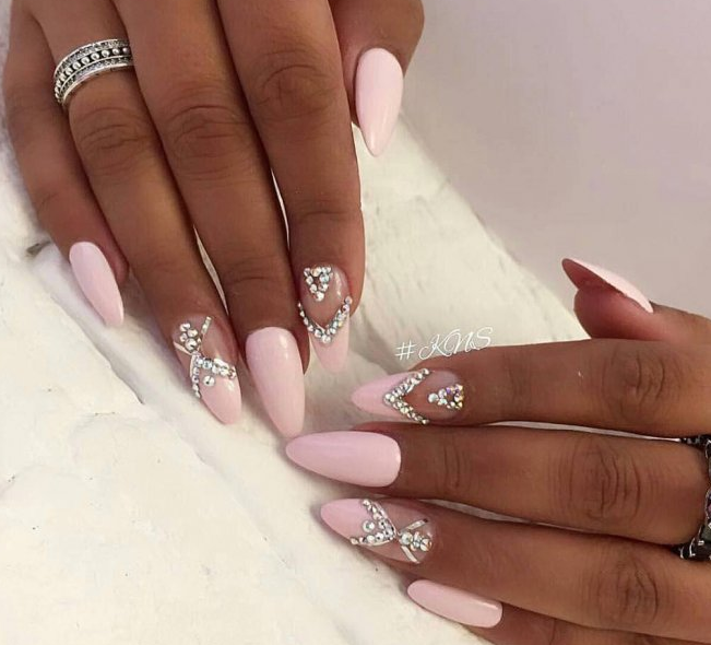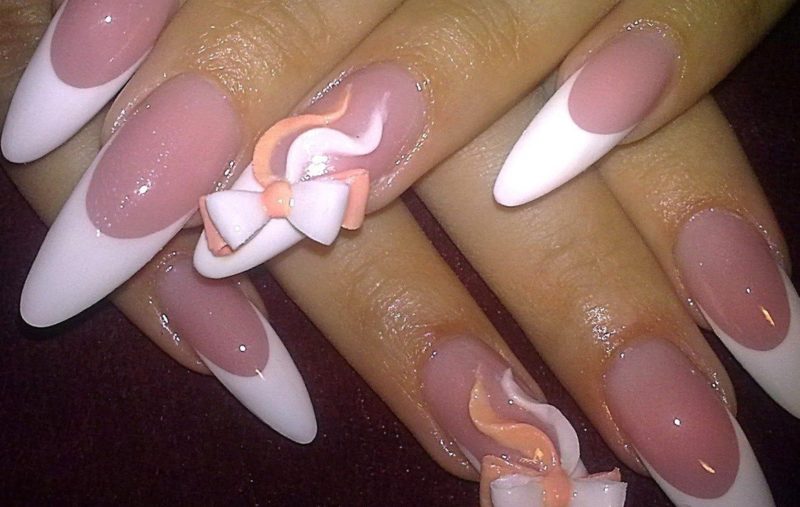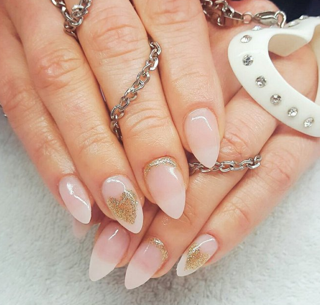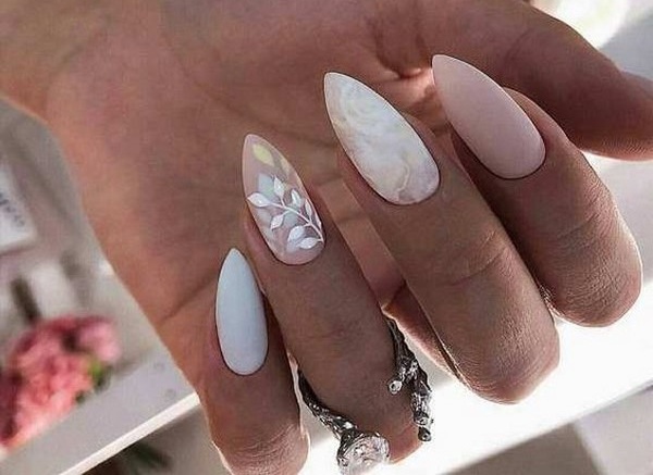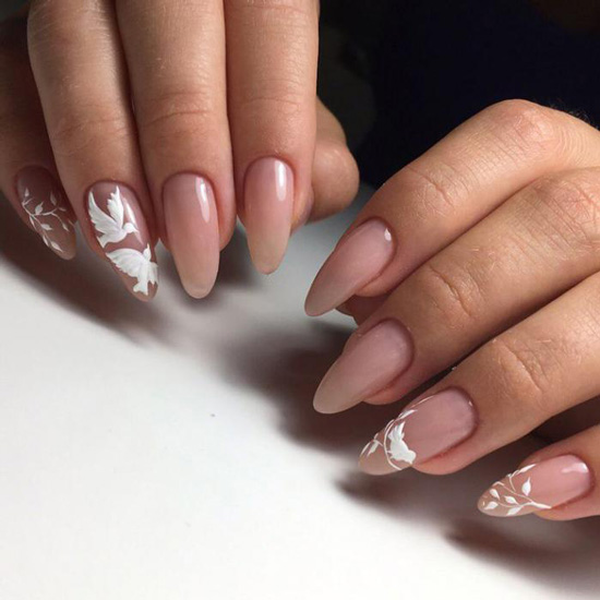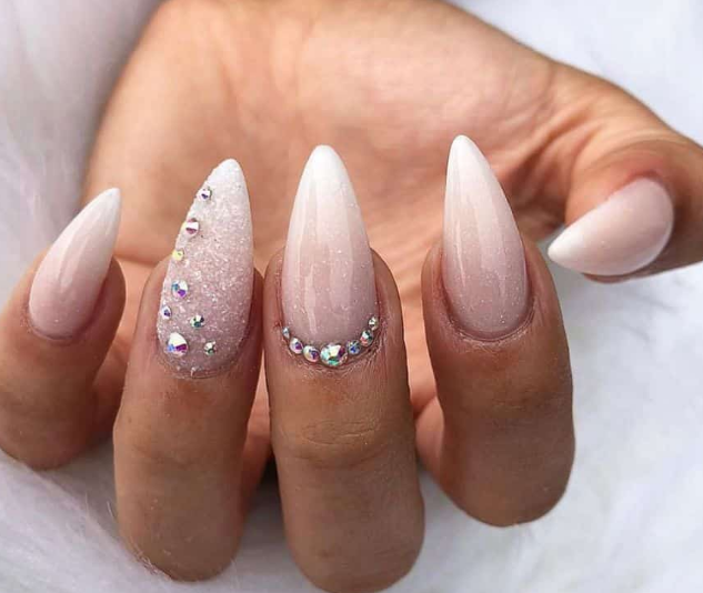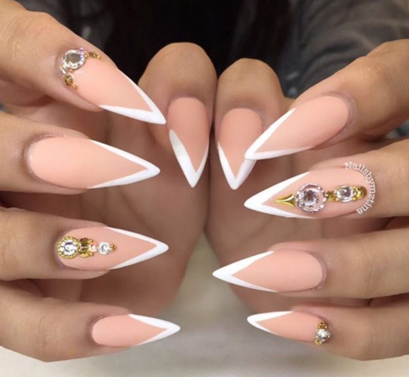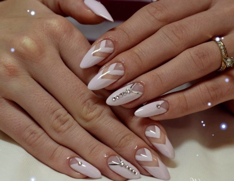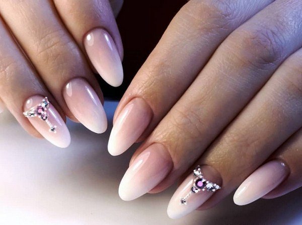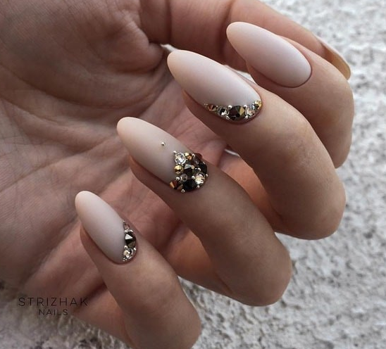 Острая форма ногтей сама по себе привлекает много внимания. Нейл-стилисты советуют оформить ее как можно проще — нюдовая база с выделением одного или двух ногтей. В качестве декора можно выбрать традиционные стразы, втирку, рисунки.