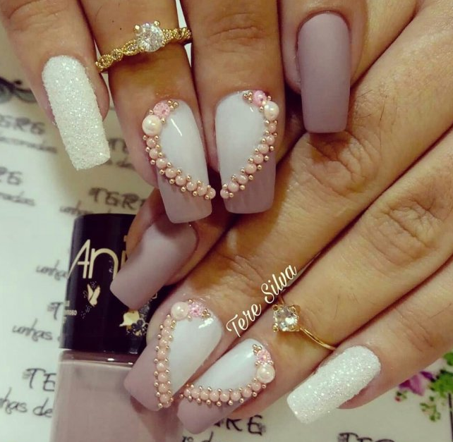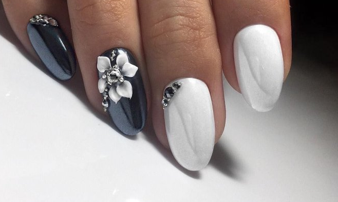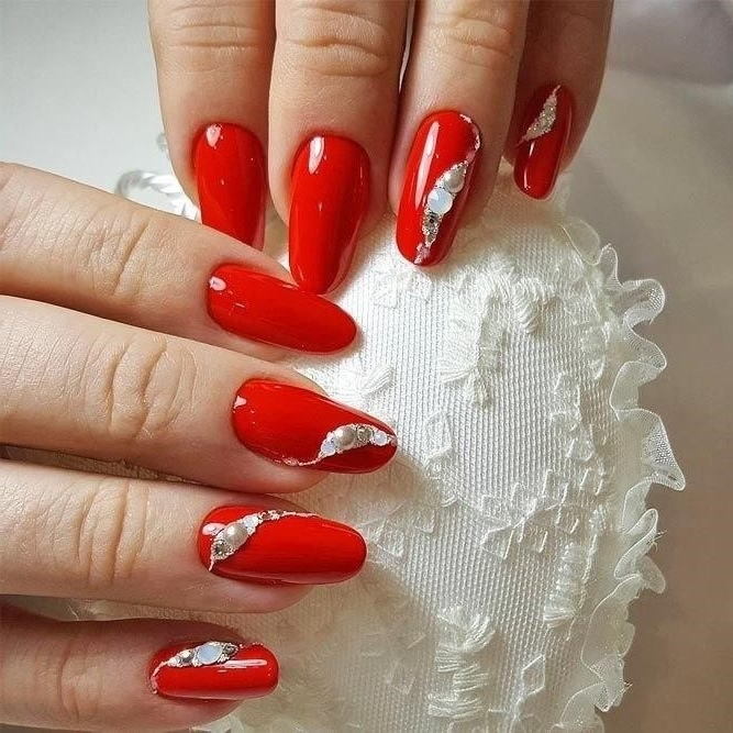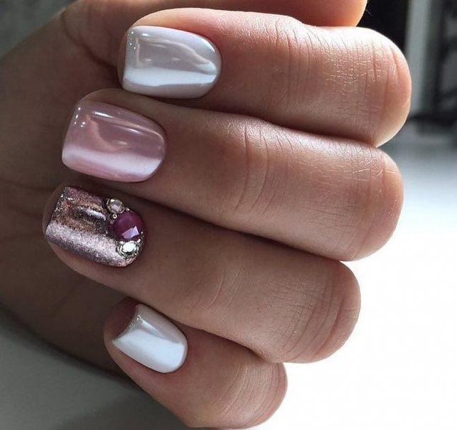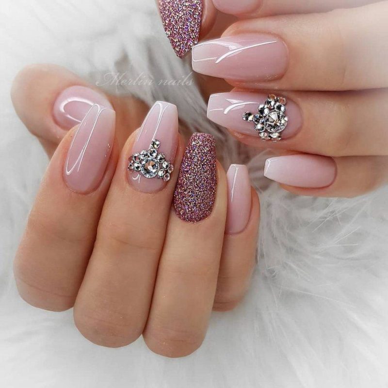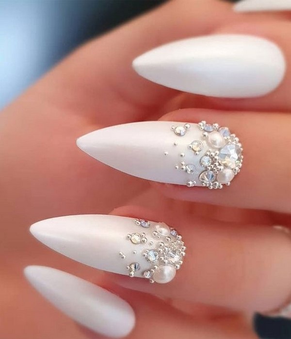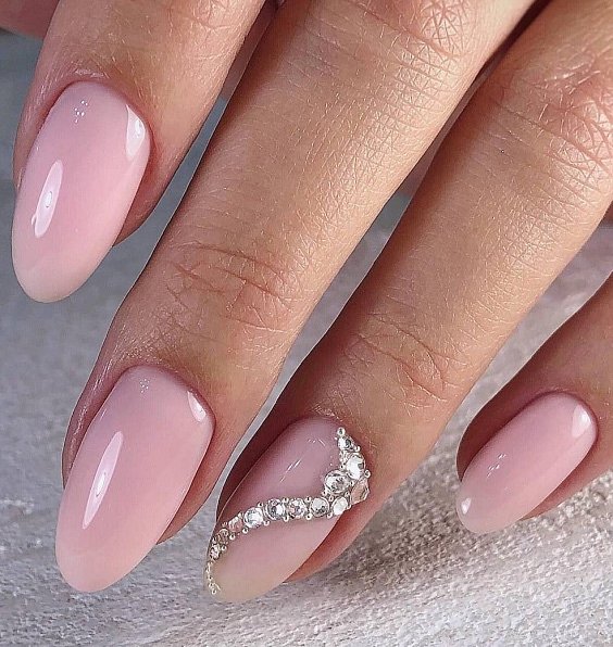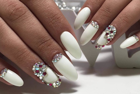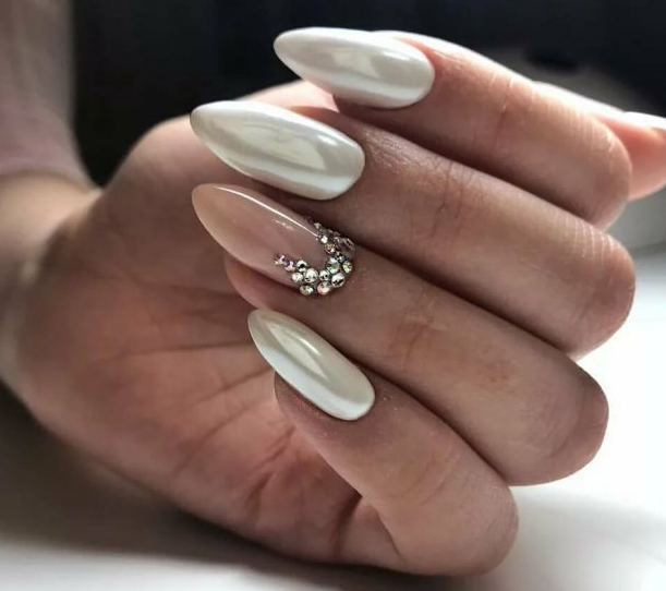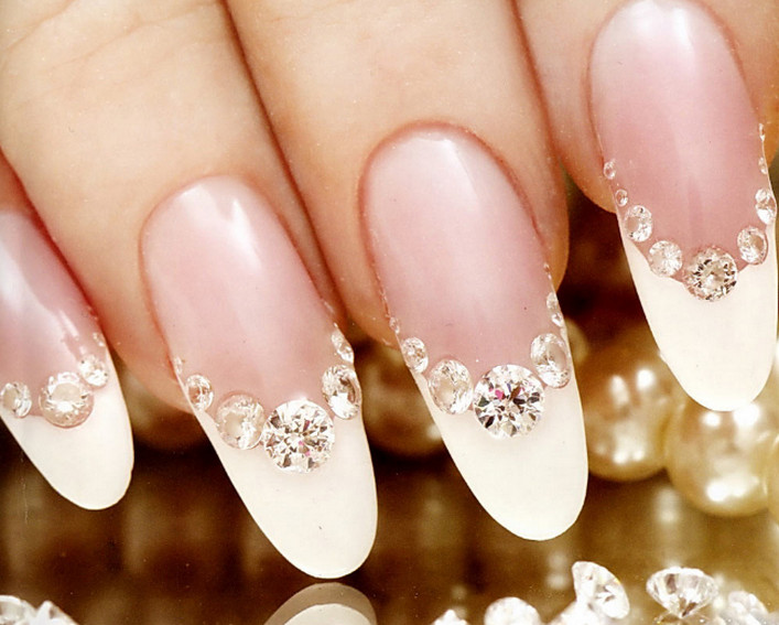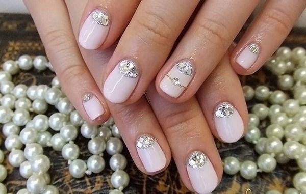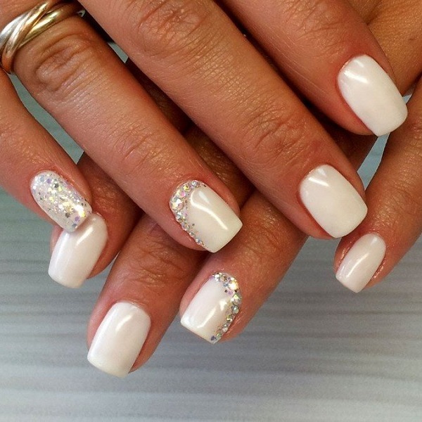 Если обычное однотонное покрытие или классический френч кажутся слишком скучными и обычными — добавьте блеска в маникюр невесты. В этом помогут искусственные камушки, которые по своей красоте не уступают бриллиантам. Помните главное правило — чем крупнее выбранные стразы, тем меньшее количество ногтей стоит выделять.