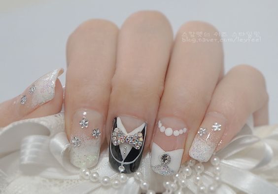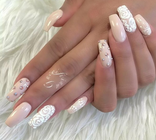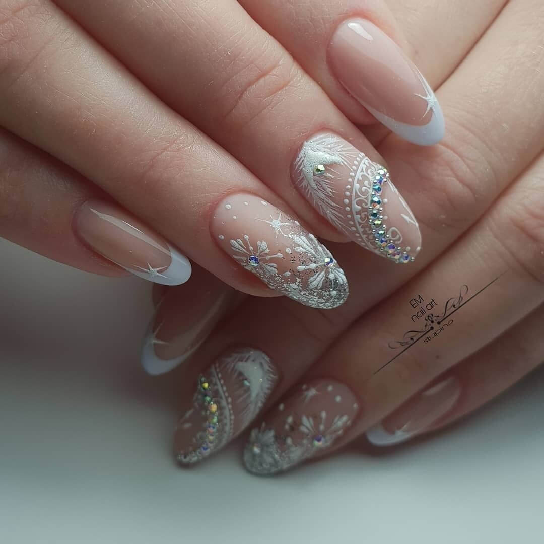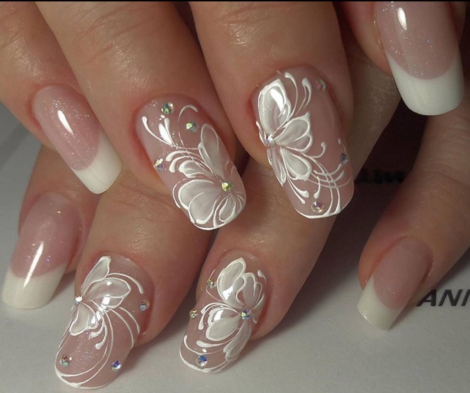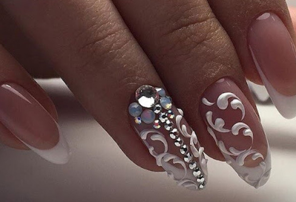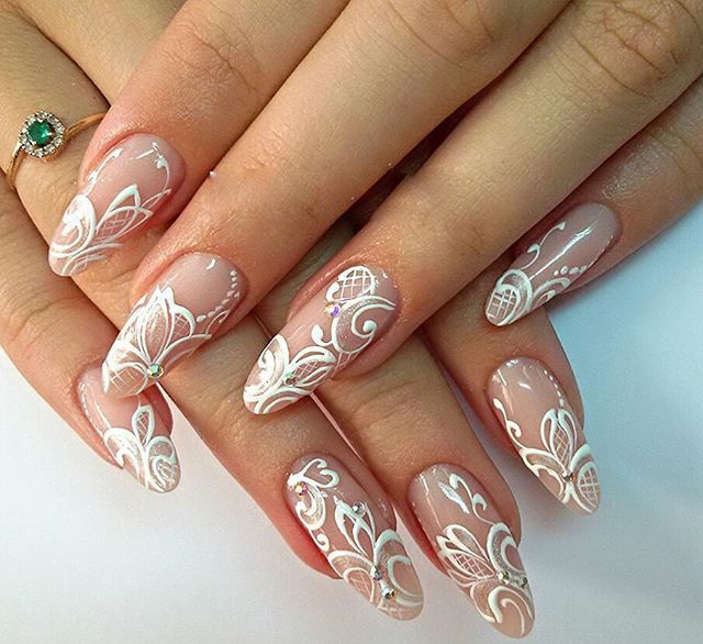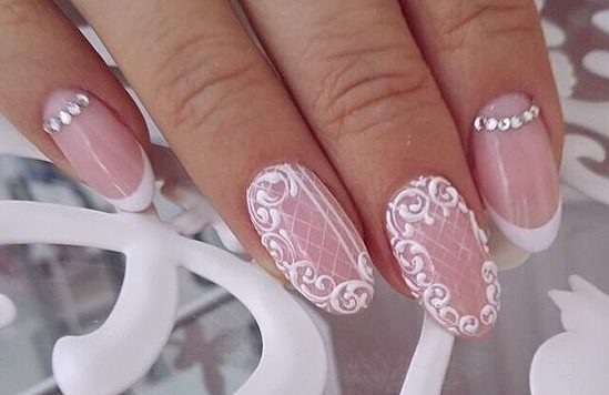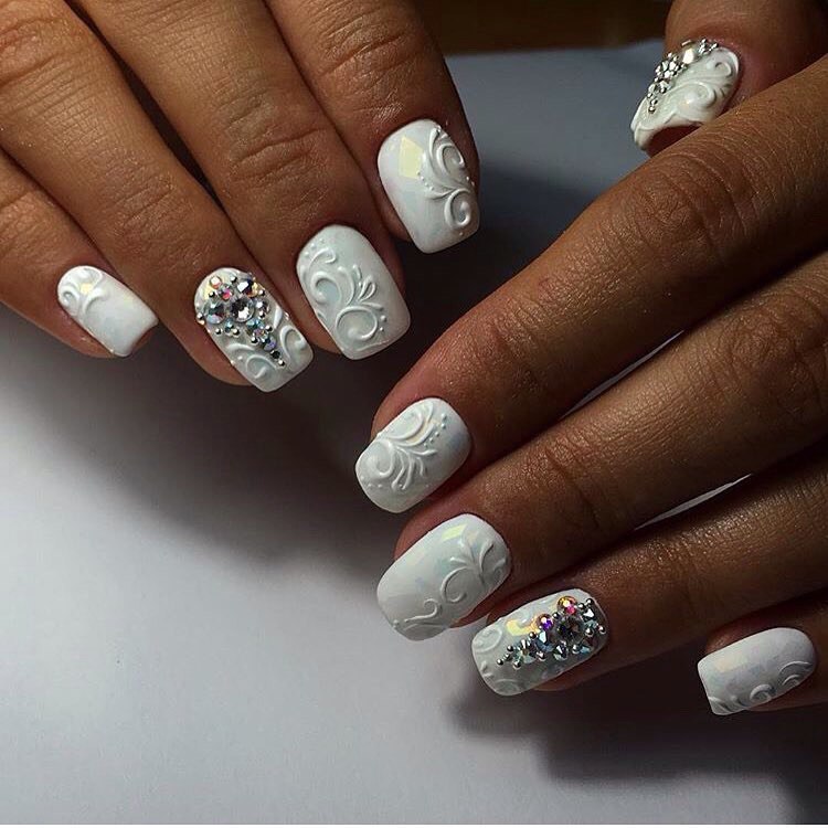 Стразы можно органично вплести в рисунок. Ограничений на цвет камней нет — выбирайте любые, которые нужны для того, чтобы воплотить в жизнь стильную задумку и сделать маникюр невесты незабываемым.
