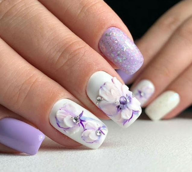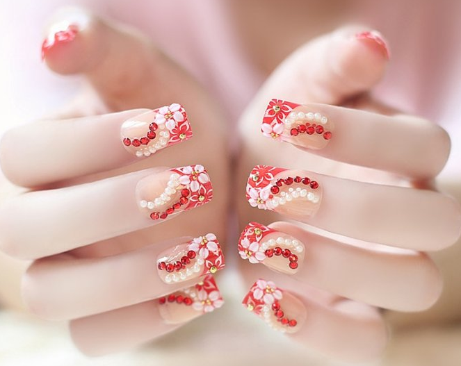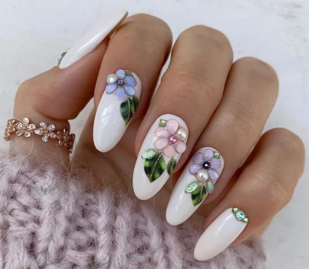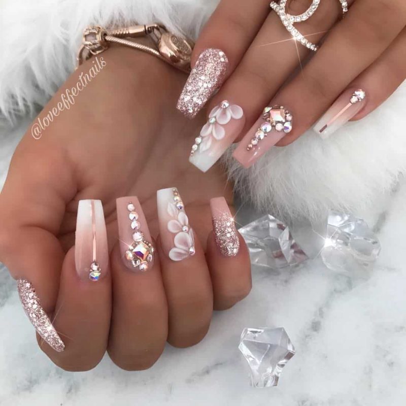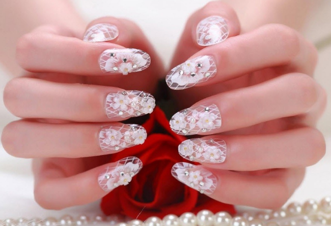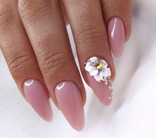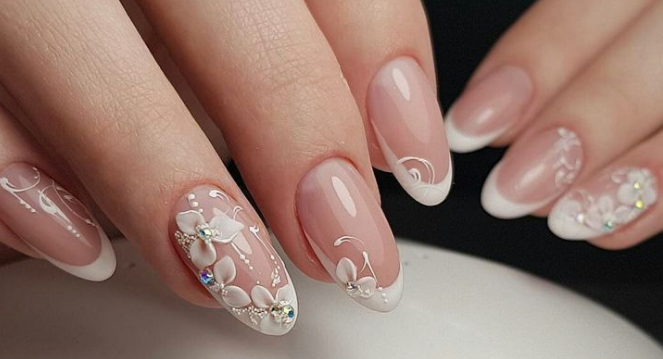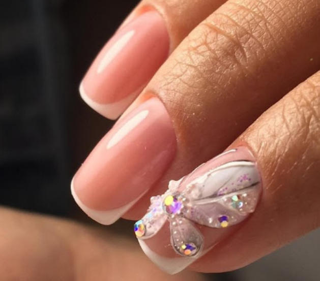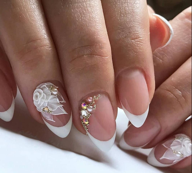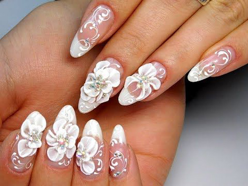 Сложный вариант маникюра, который часто выглядит как произведение искусства — 3D фигурки на ногтях невесты. Это могут быть цветы, бабочки, сердечки и другие атрибуты романтики.