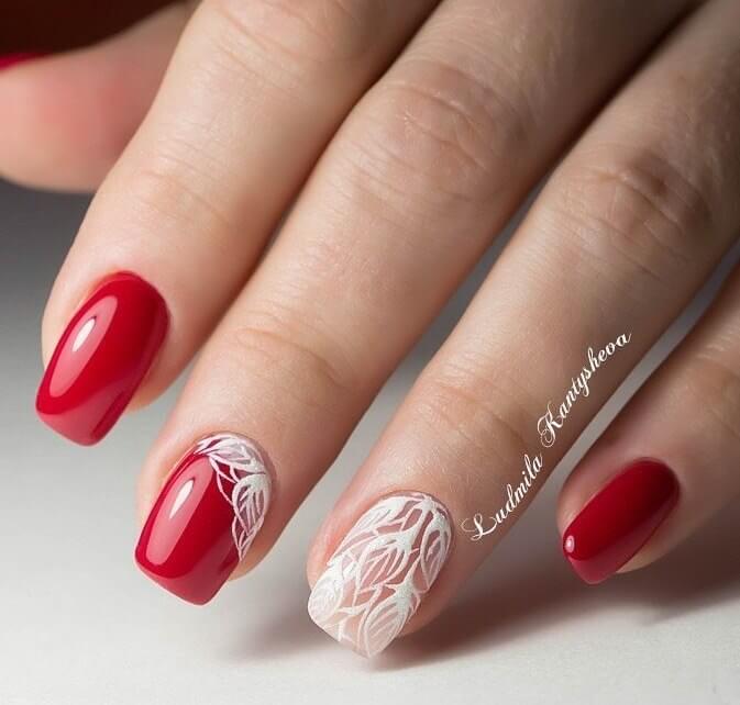 Достаточно густой и яркий оттенок для свадьбы. Эффектно смотрится глянцевое однотонное покрытие. Последнее можно дополнить белым — такая невеста будет не только стильной, но и оригинальной.