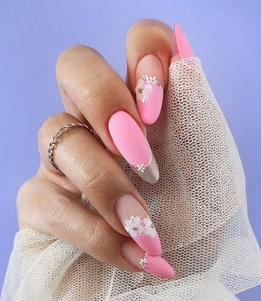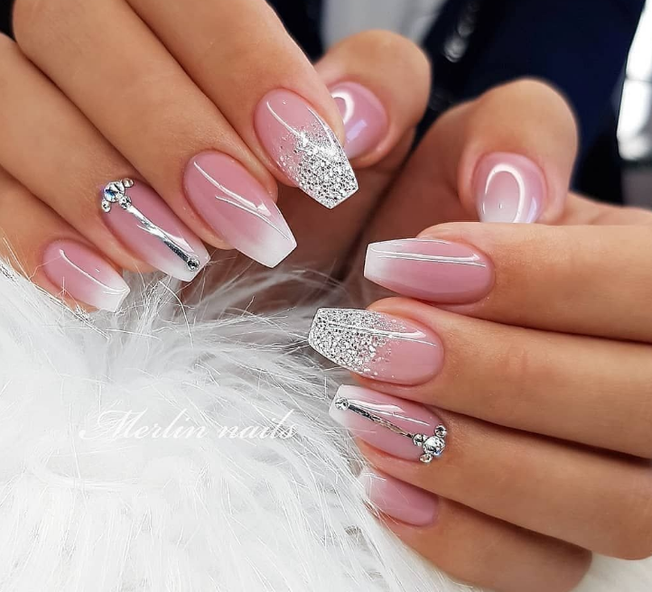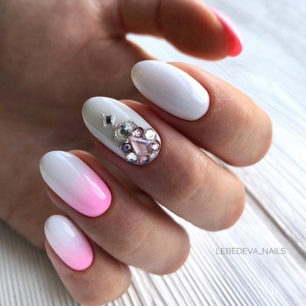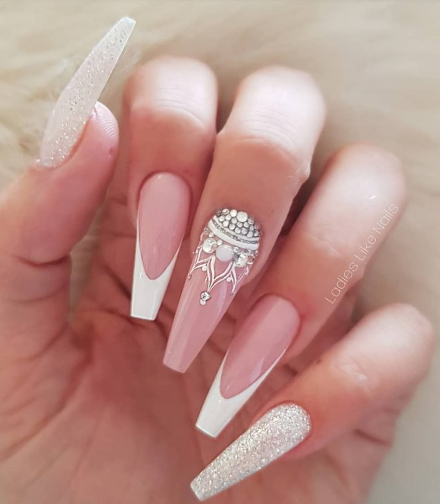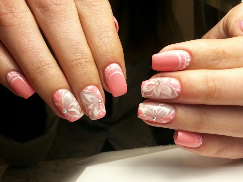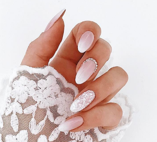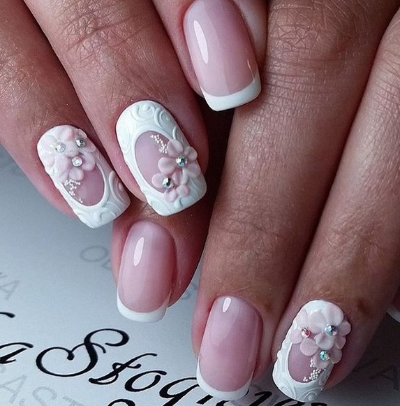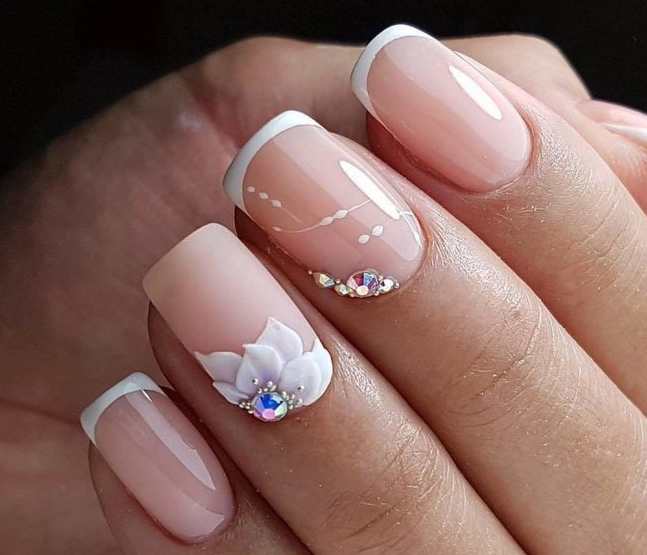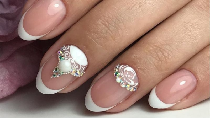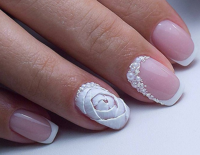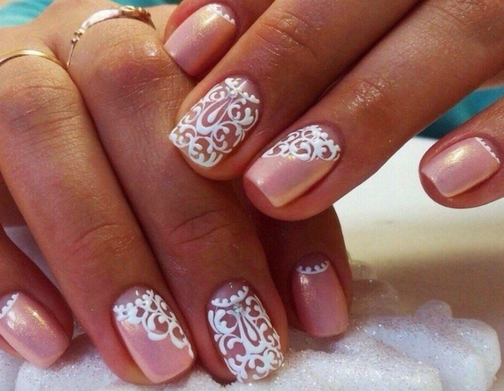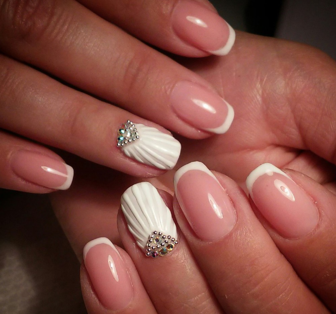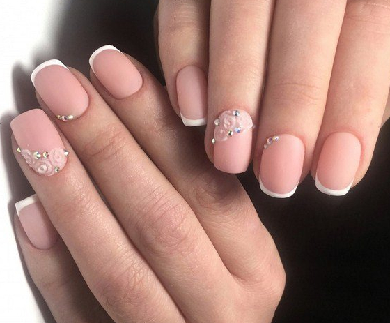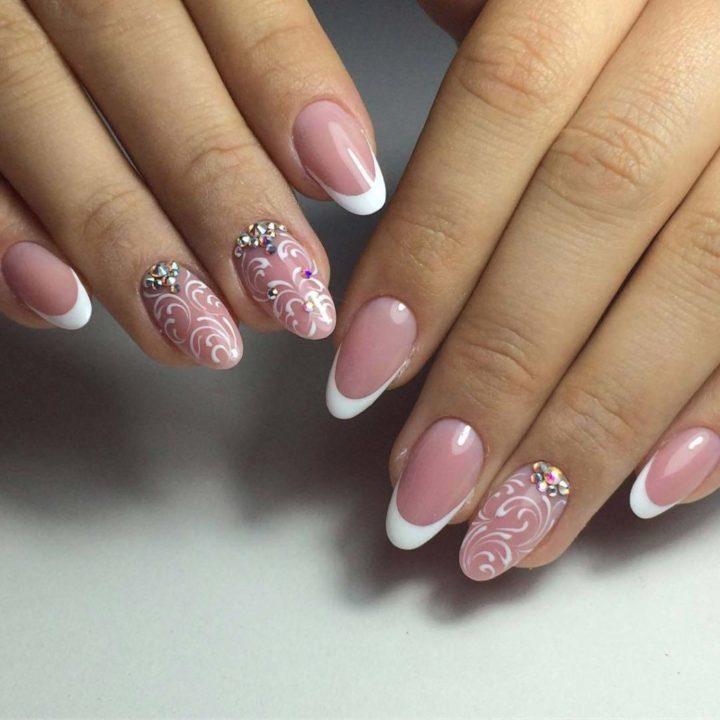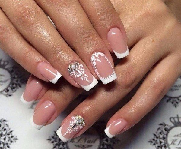 Розовый маникюр с декором из камней, белым френчем или лунками — естественный и нежный вариант для свадьбы. Розовые тона подойдут под любое платье, которому отдаст предпочтение невеста.