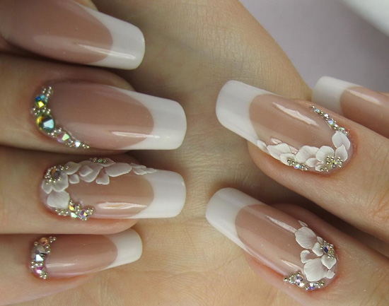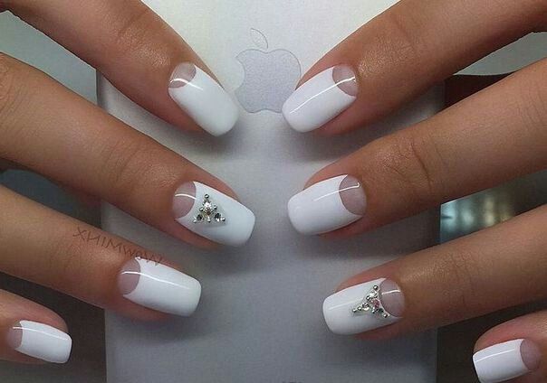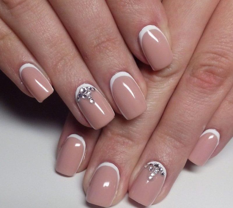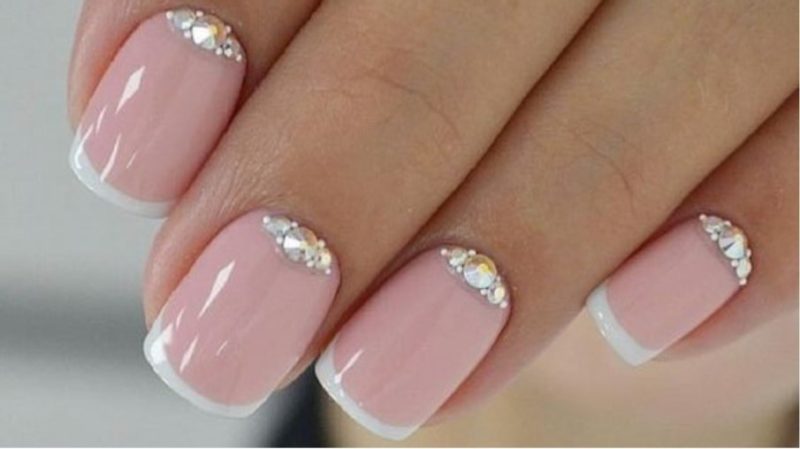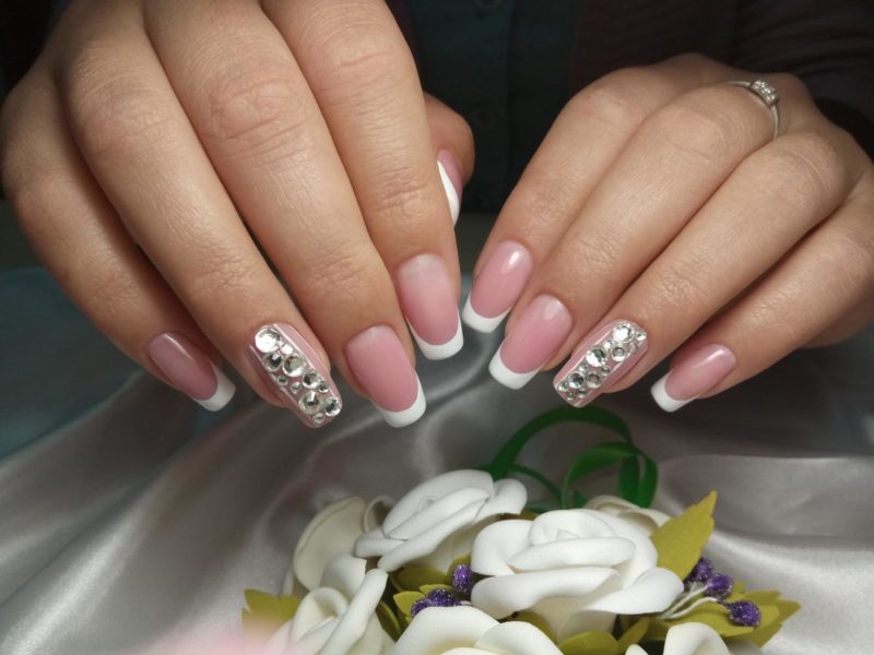 - классический вариант французского маникюра с украшением стразами.