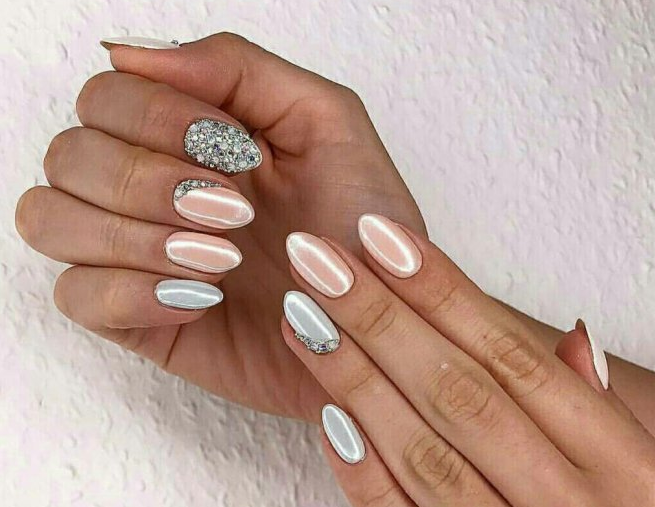 Жемчужная втирка — отличный вариант декора для дизайна на свадьбу. В этот праздничный день втиркой можно оформить пластины на обеих руках или оставить сияние только на одном или двух ногтях.