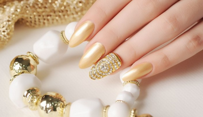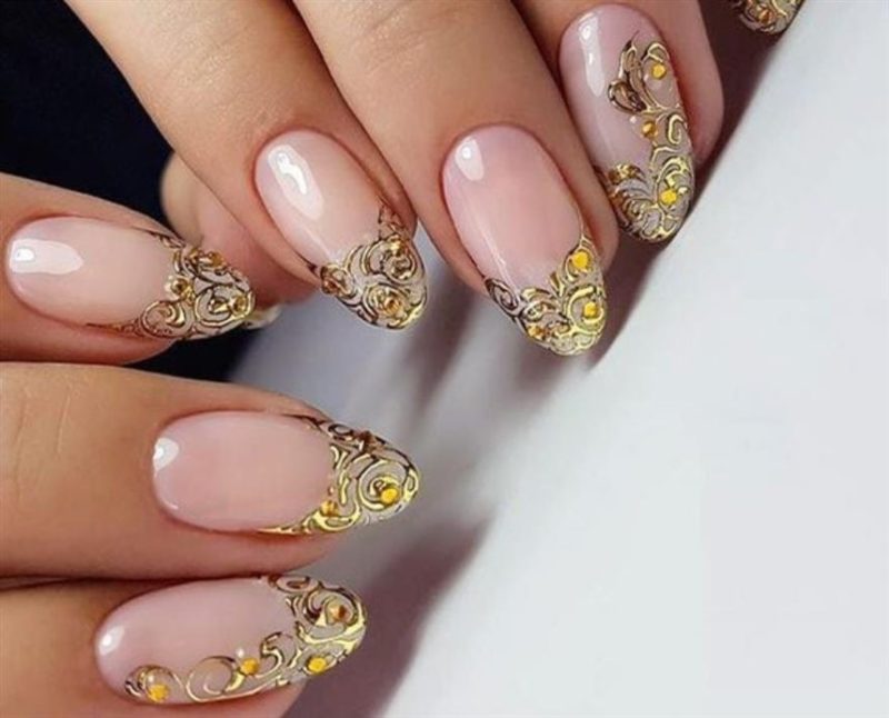 Как правило, обручальные кольца в нашей стране выполнены из золота. Что же может лучше всего оттенить блеск благородного металла? Конечно, золотой цвет. Только не усердствуйте — для маникюра невесты можно выделить один палец (полное покрытие), нарисовать кружево или вензеля золотом.