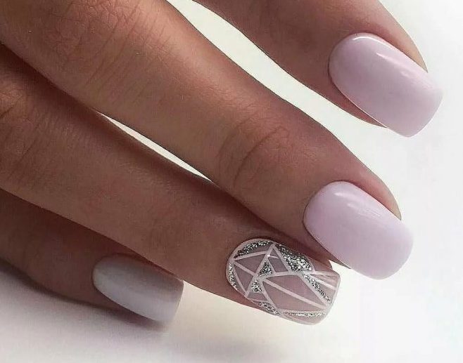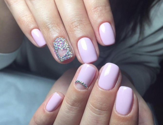 Тренд сезона — однотонное покрытие в сочетании с прозрачной базой, на которую нанесен рисунок — нежные цветы, кружево или обычные фольгированные полоски. Отлично смотрится и лунный маникюр с минималистичным выделением небольшими камнями.