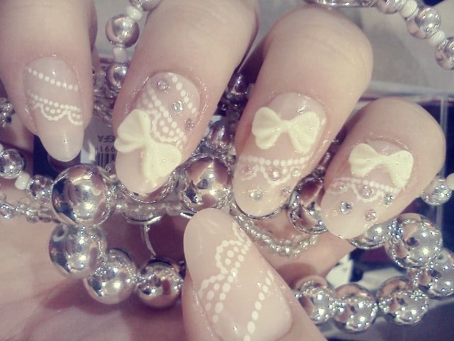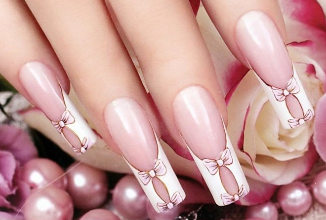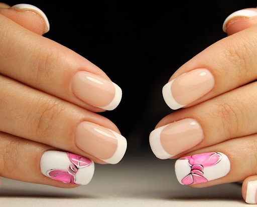 Бантики — абсолютно “девочковый” стиль. Изображение бантиков на прозрачном фоне — это нежно и изящно. Рисунок может быть выполнен любым нюдовым оттенком. Для достижения большего эффекта его стоит выполнить с матовым топом.