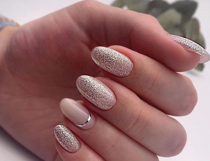 Если не хочется утяжелять пластину камнями, подойдут блестки — рассыпные или гель-лак с блестками. Вы можете покрыть все пластины разом, выделить несколько ногтей или создать затейливый (или очень простой) рисунок.