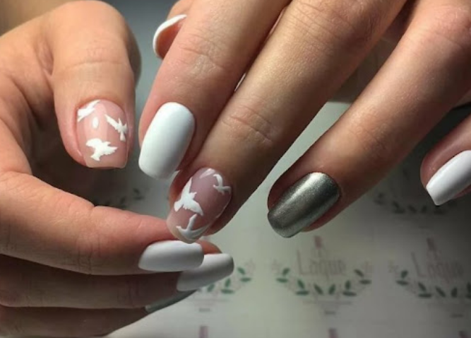 Любимая традиция молодоженов — выпускать голубей на свадьбе. Мотивы такого обычая можно повторить и в дизайне ногтей. Интересно смотрится вариант, когда два голубка расположены на разных ногтях невесты, но при приближении пальцев они оказываются рядышком.