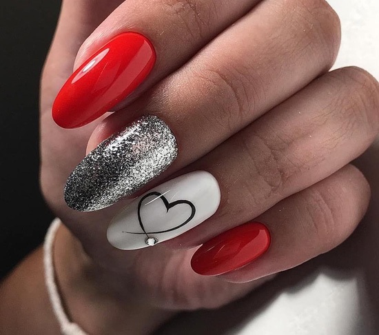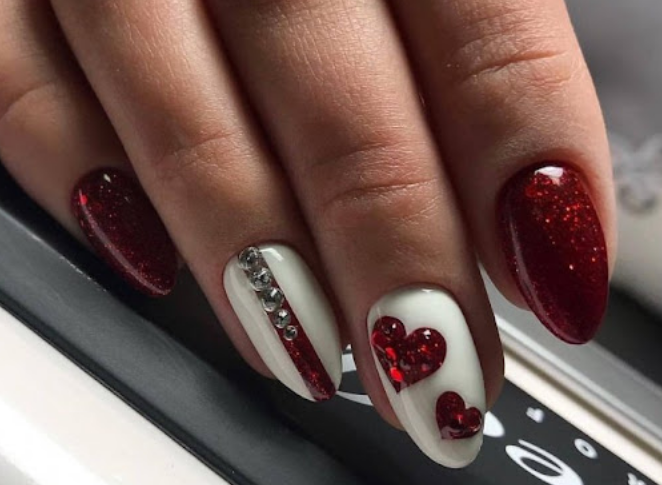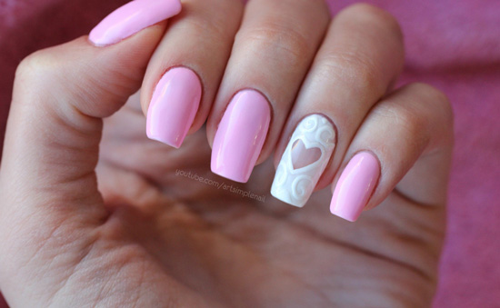 Традиционный символ любви — сердечко. Конечно, необязательно рисовать красные сердца на каждом ноготке. Для невесты, маникюр которой выполнен в нюдовых тонах, стоит выбрать белый, бежевый, розовый контур и заполнение рисунка.