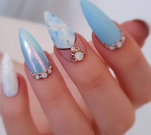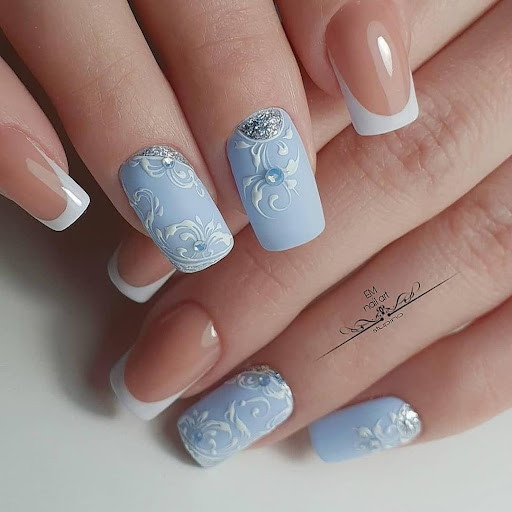 Непривычный, но не менее эффектный вариант маникюра невесты. Голубой или более интенсивный бирюзовый “подружатся” со стразами, рисунками, лепкой и французским дизайном. Особенно эффектно на голубом смотрится серебристый декор.