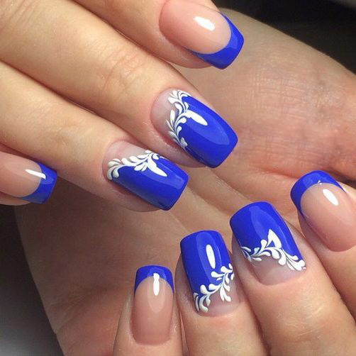 Совет: мастера нейл-арта предлагают эффектный дизайн — треугольный френч с синим и белым выделением края пластины на прозрачной базе.