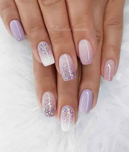 - френч — традиционный, треугольный. Декор — стразы, полоски из лака с блестками;