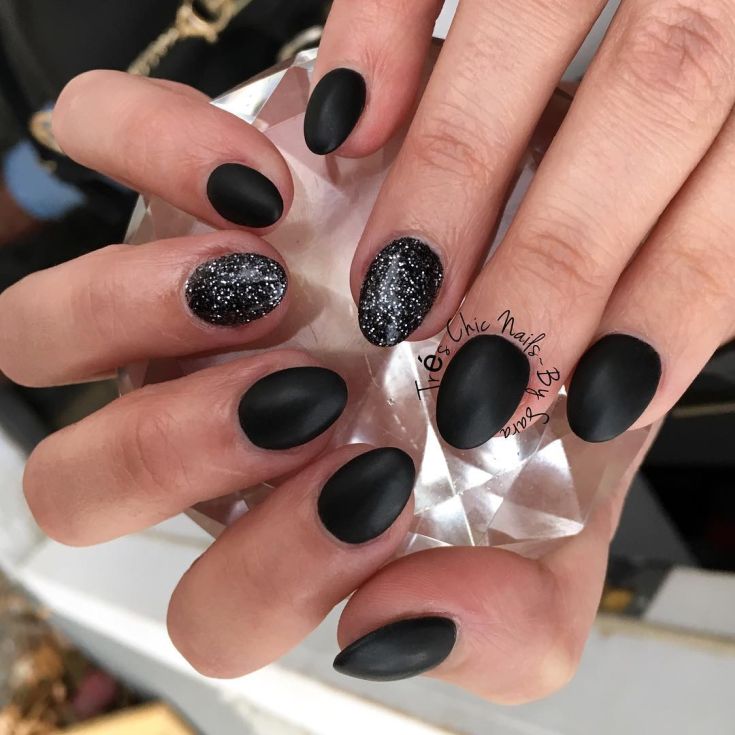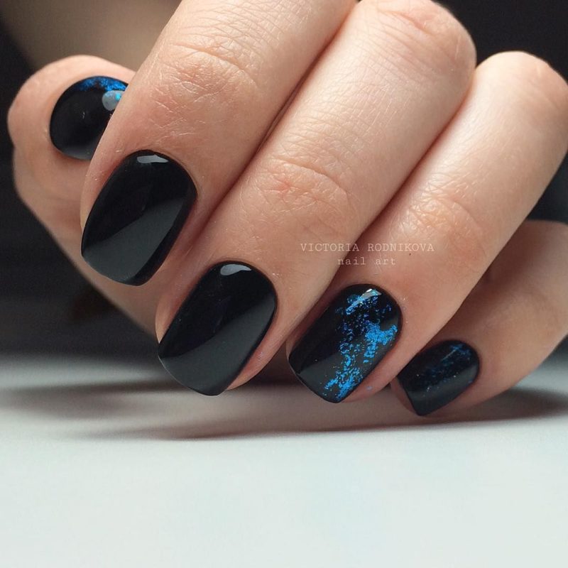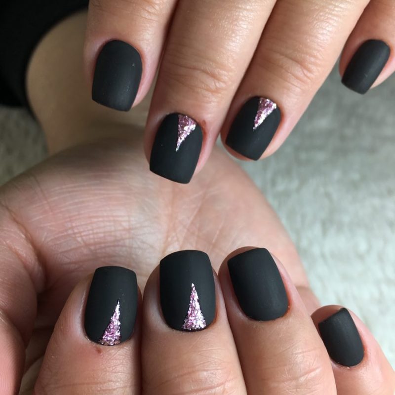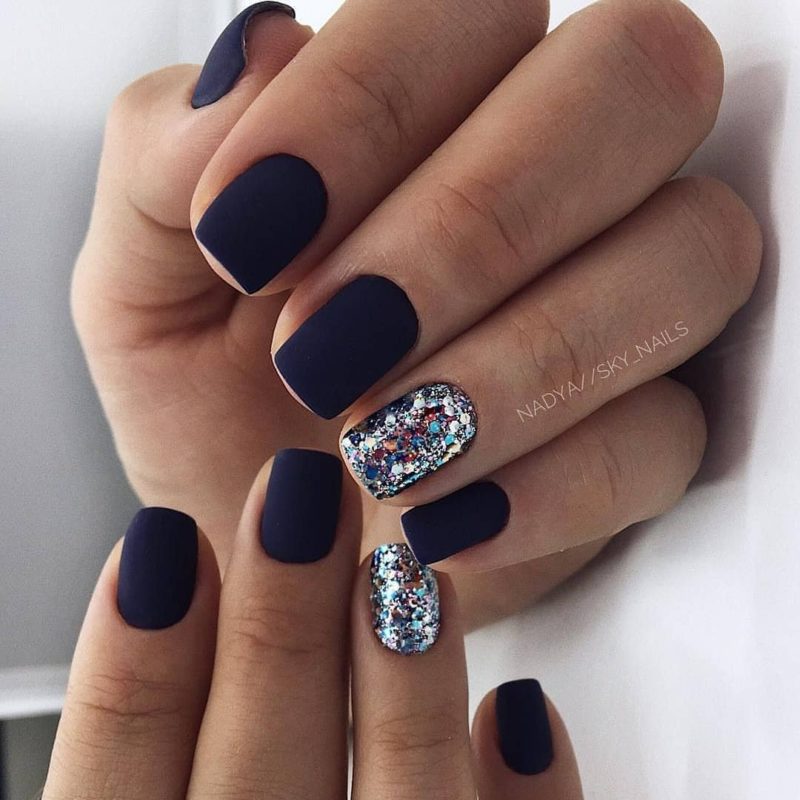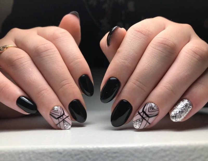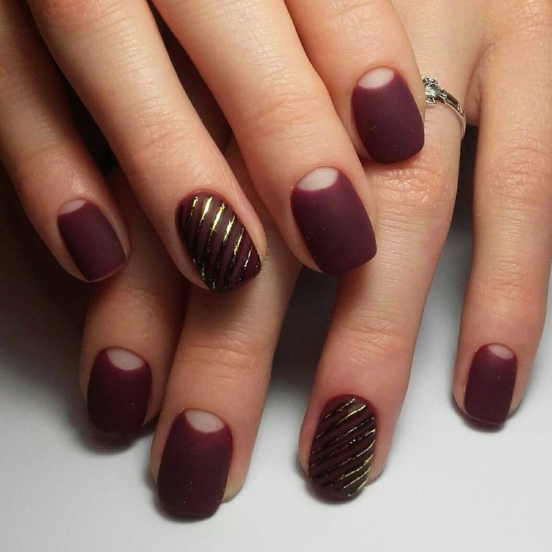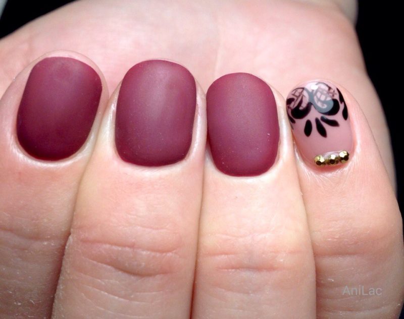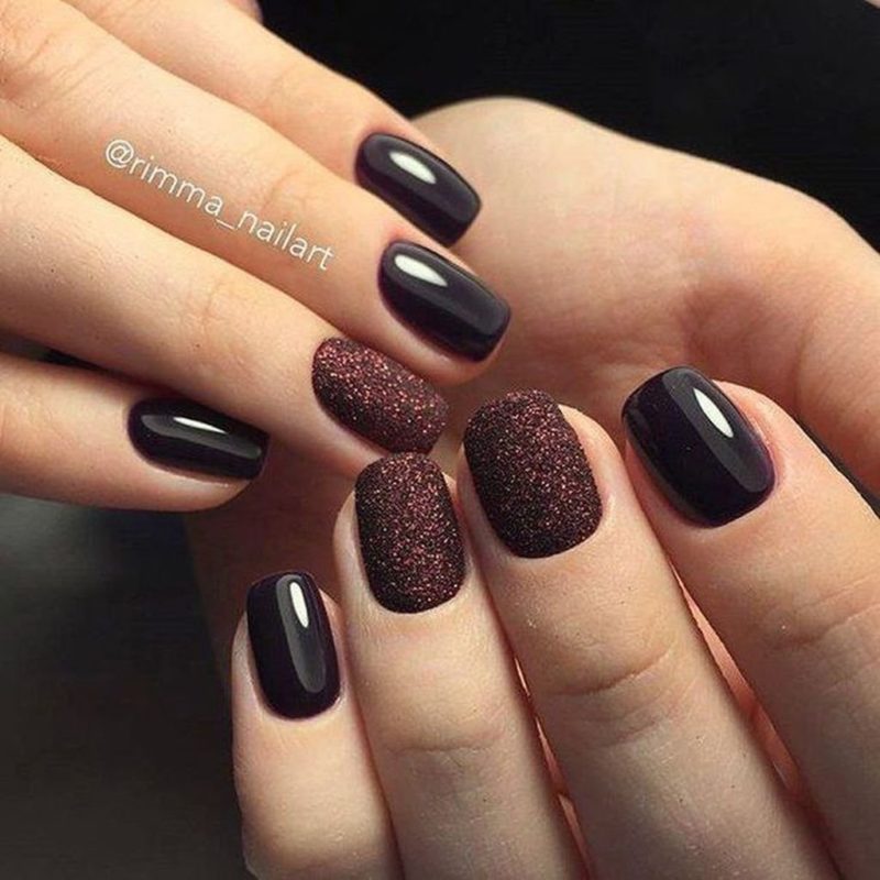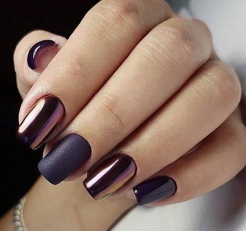 Массу идей для воплощения даст комбинация матового топа в глянце и темные тона. К примеру, можно выделить несколько ногтей глянцем или нанести матовое покрытие. Также оригинально будут смотреться вариации с созданием узоров из глянца, блестящая втирка и многое другое.