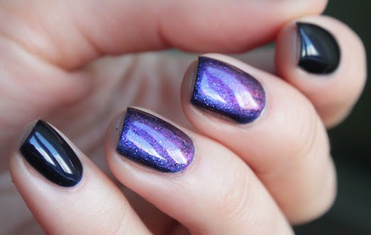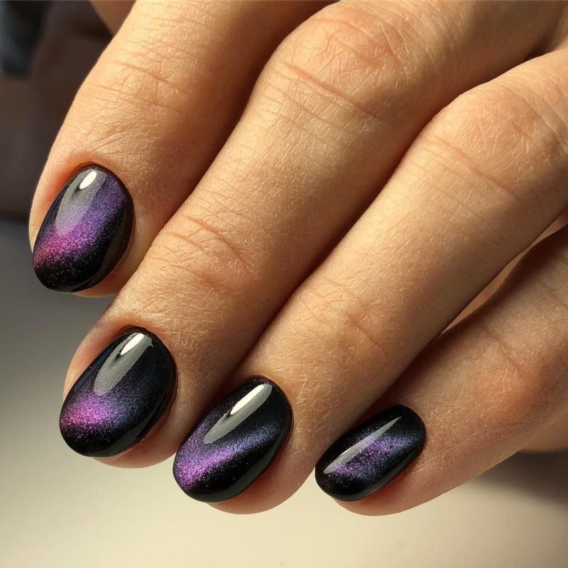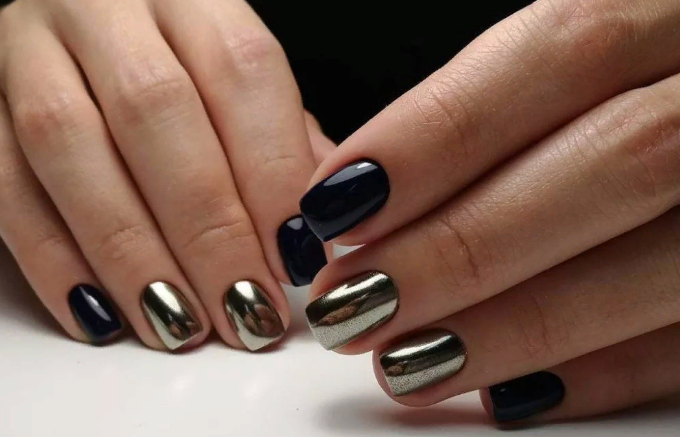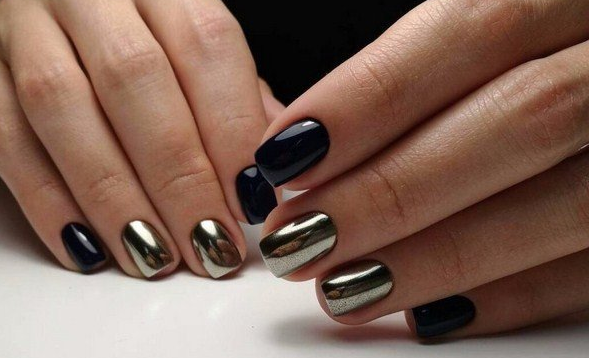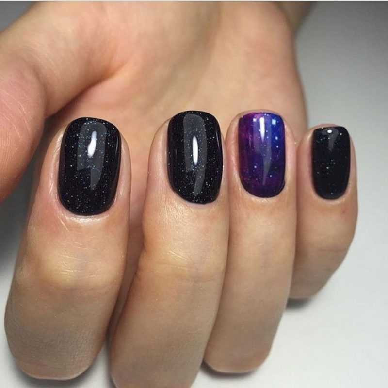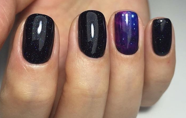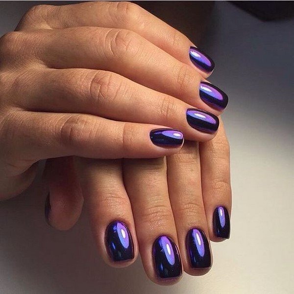 Для темного маникюра на очень коротких ногтях подойдет втирка ярких и блестящих оттенков: