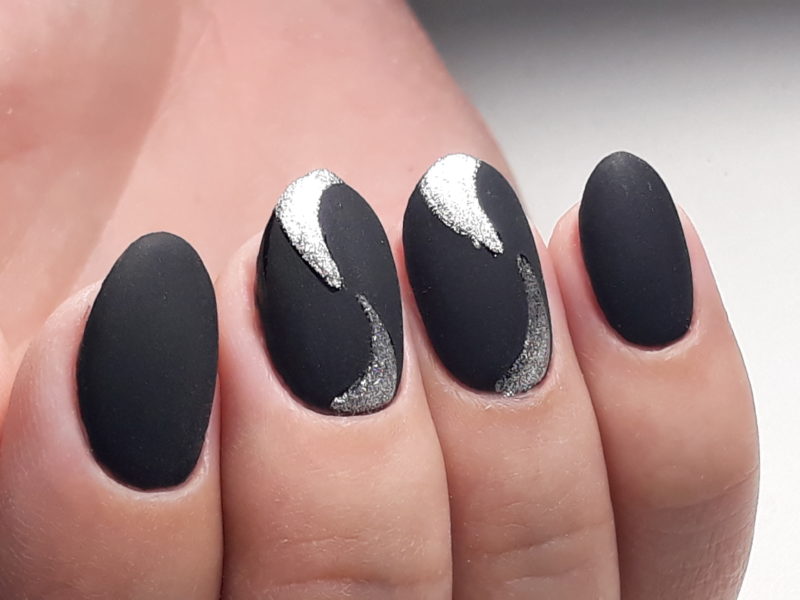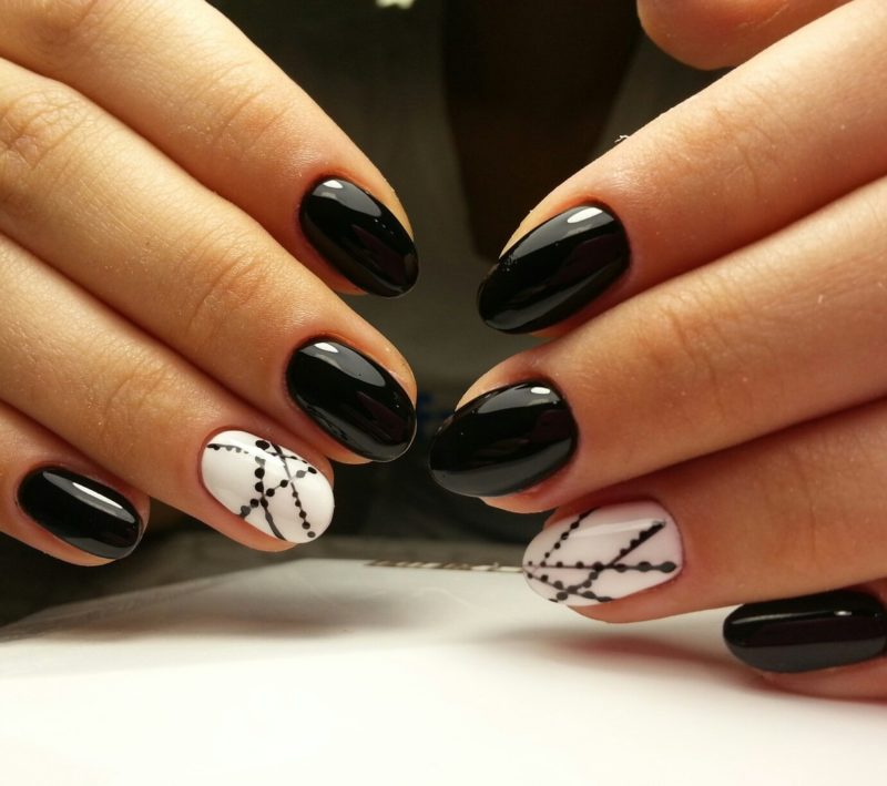 Благодаря темному дизайну на коротких ноготках можно подчеркнуть миндалевидную форму ногтевой пластины. Это можно сделать при помощи следующих вариаций: