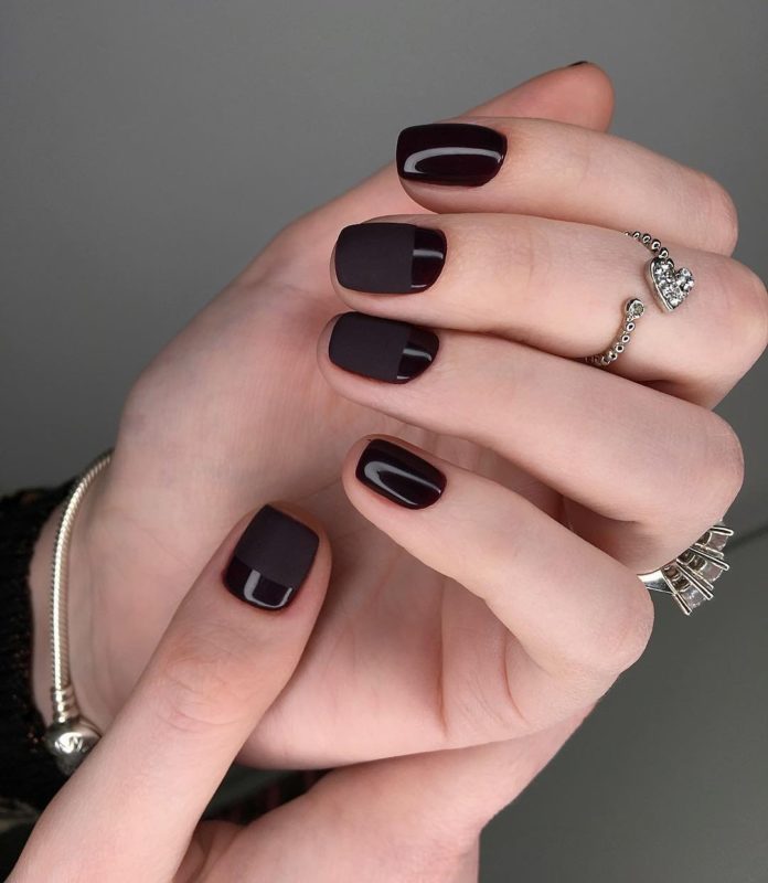 Особенностью маникюра на короткие ногти в темных тонах заключается в контрастном выделении ногтевой пластины.