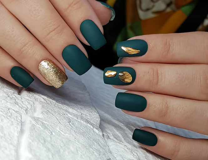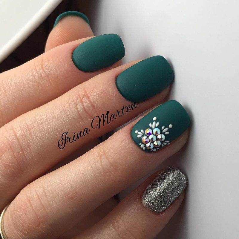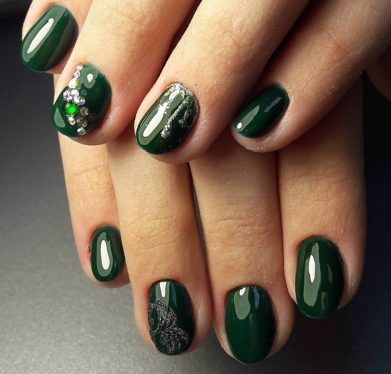Идеальным дополнением общего образа станет использование страз. Также можно сделать вариант темно-зеленого маникюра с золотой фольгой.