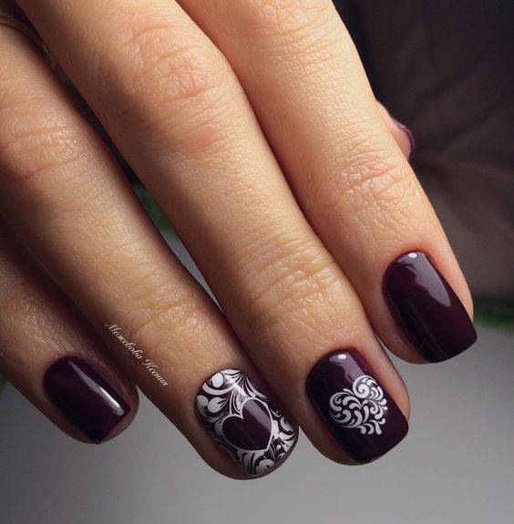 Для праздничных мероприятий подойдет красивый темный маникюр на коротких ногтях с применением акриловой пудры, кружевной росписи. Прекрасно сочетается с черными и белыми оттенками. Гламурности, элегантности в дизайне можно добиться с использованием серебра и золота.