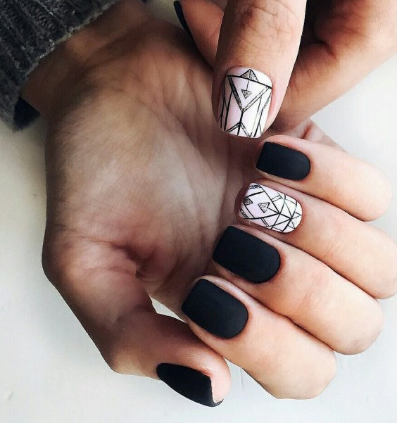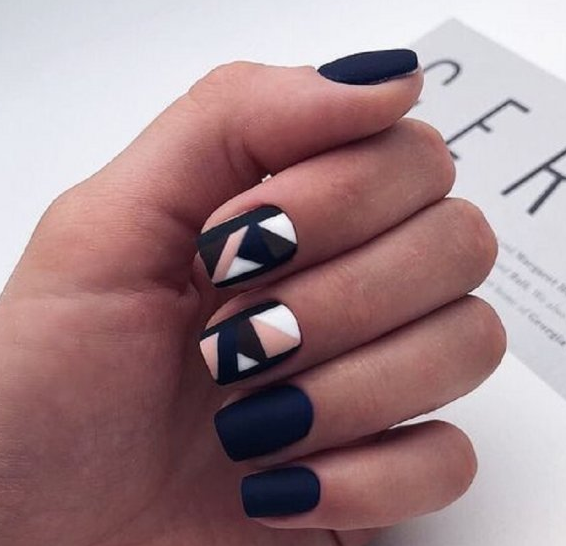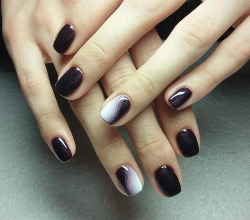 Красоту маникюра на короткие ногти в темных тонах подчеркнет использование различных геометрических фрагментов, абстрактных рисунков. Они не только придадут оригинальности, стильности маникюру, но и подчеркнут красоту рук представительниц прекрасного пола.