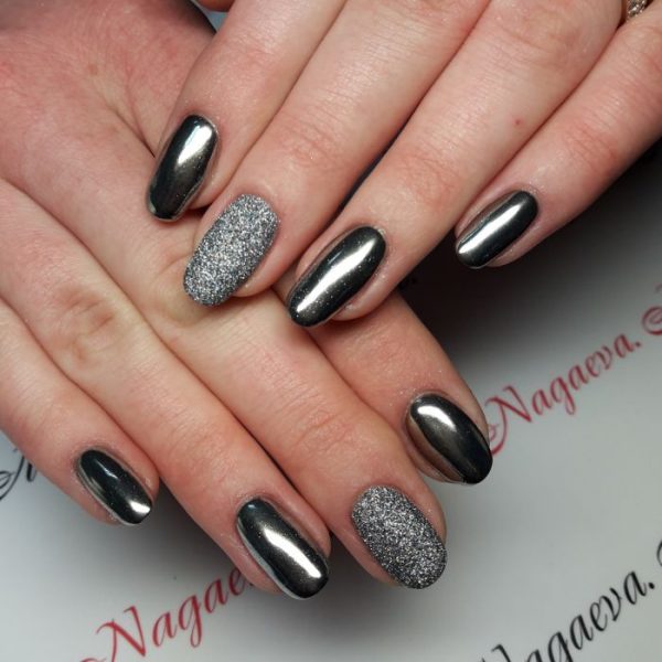 Ее можно наносить либо на один или два пальца, либо сделать френч, либо оформить пол ногтевой пластины. Помимо этого возможно создание градиента с ее использованием. Плавный переход из серных тонов в блестящие придадут маникюру завораживающее действие, загадку.