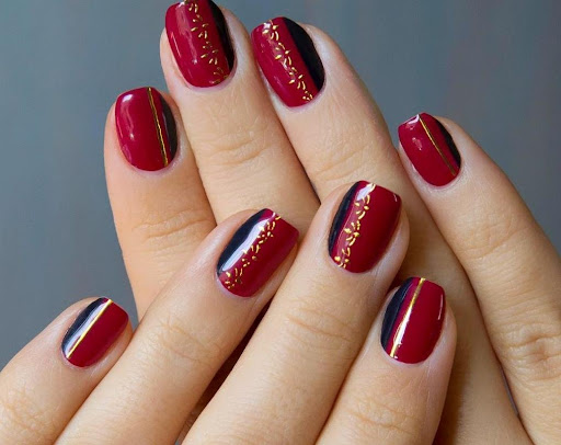В данном случае негативное пространство либо с черным, либо с темным бордо дадут шикарный результат, который можно дополнить стразами, блестками.