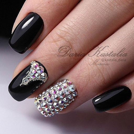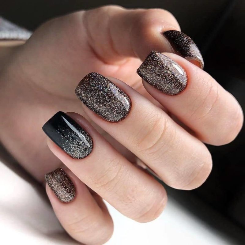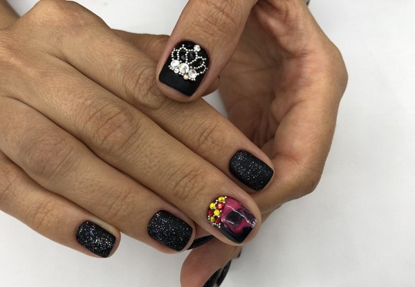 Темный дизайн на коротких ногтях изначально подразумевает использование блесток, страз, фольги, камифубуков.