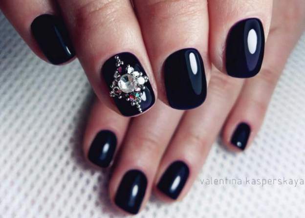 В этом сезоне мода на маникюр в темных тонах продолжает пользоваться огромной популярностью среди прекрасных дам. Такое произведение искусства смотрится стильно, элегантно роскошно на женских ноготках. Именно темный маникюр лучше смотрится на короткой форме ногтей. Благодаря современным технологиям его можно дополнить разнообразными декорами – стразами, рисунками, блестками, бульонками и т.д.